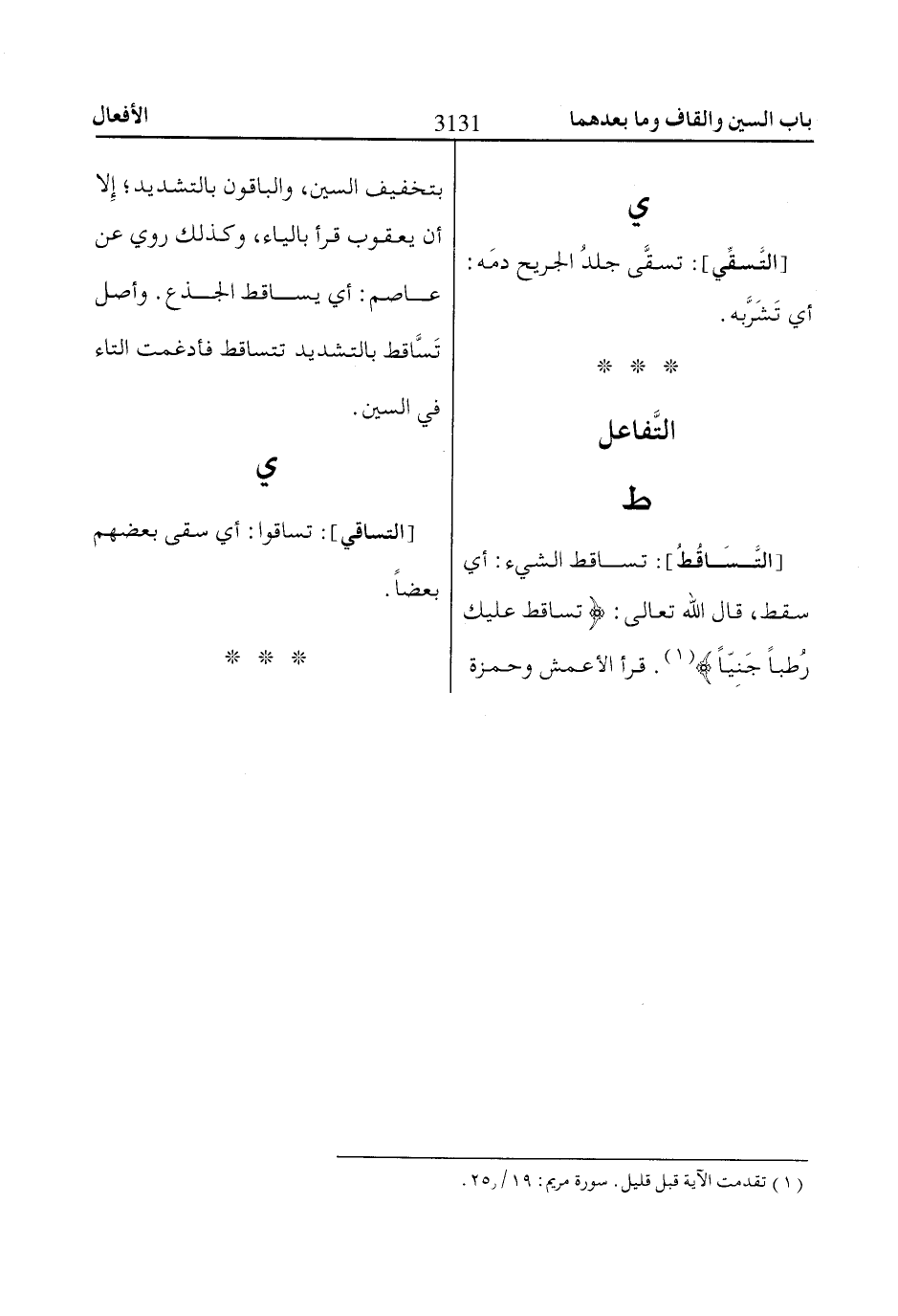 [التَّسَاقُطُ]: تساقط الشيء: أي سقط، قال الله تعالى: تُسااقِطْ عَلَيْكِ رُطَباً جَنِيًّا «1». قرأ الأعمش وحمزة بتخفيف السين، والباقون بالتشديد؛ إِلا أن يعقوب قرأ بالياء، وكذلك روي عن عاصم: أي يساقط الجذع. وأصل تَسَّاقط بالتشديد تتساقط فأدغمت التاء في السين.