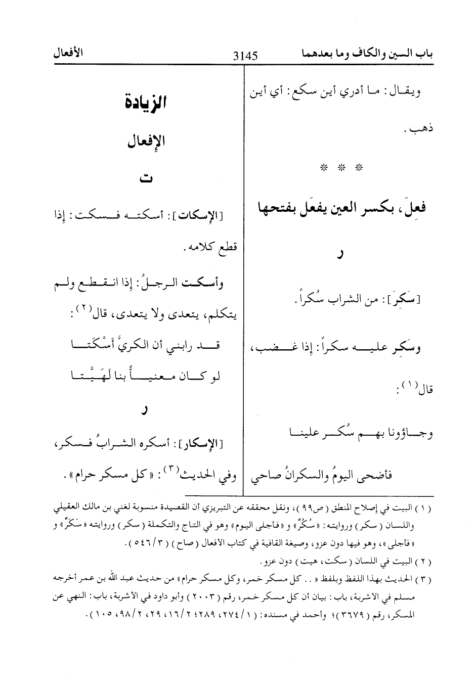(1) البيت في إِصلاح المنطق (ص 99)، ونقل محققه عن التبريزي أن القصيدة منسوبة لغني بن مالك العقيلي واللسان (سكر) وروايته: