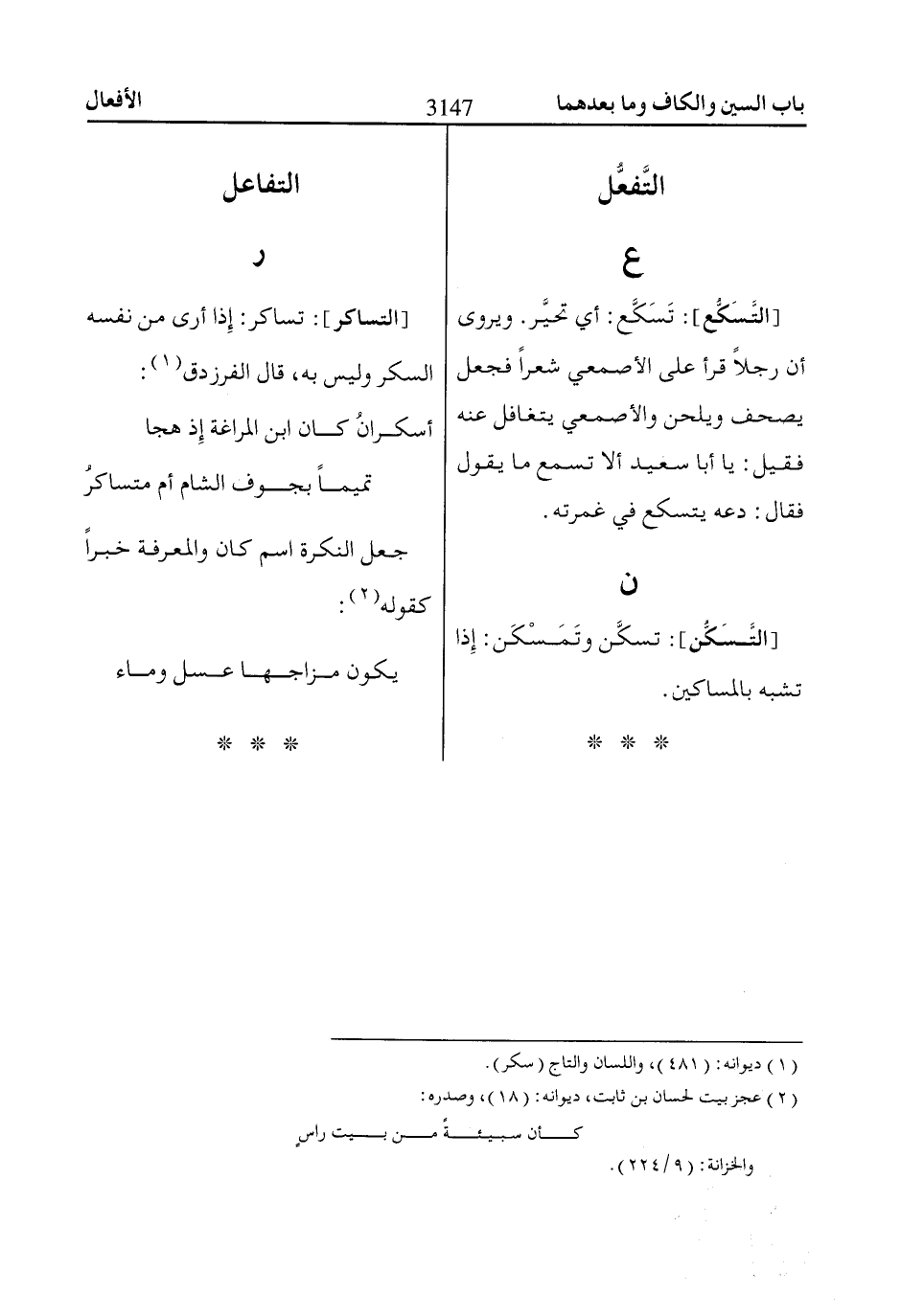 [التساكر]: تساكر: إِذا أرى من نفسه السكر وليس به، قال الفرزدق «1»: