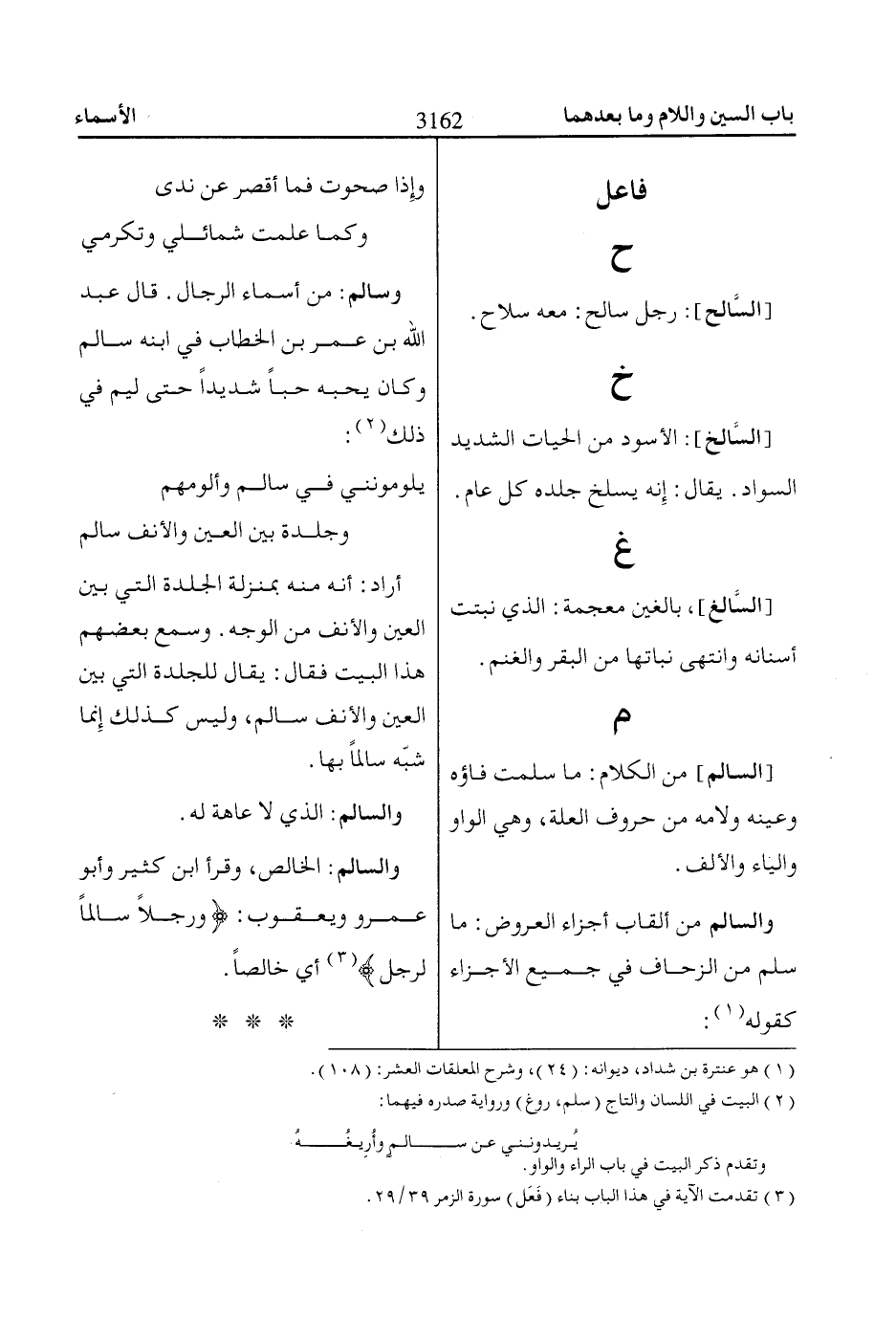 [السالم] من الكلام: ما سلمت فاؤه وعينه ولامه من حروف العلة، وهي الواو والياء والألف.