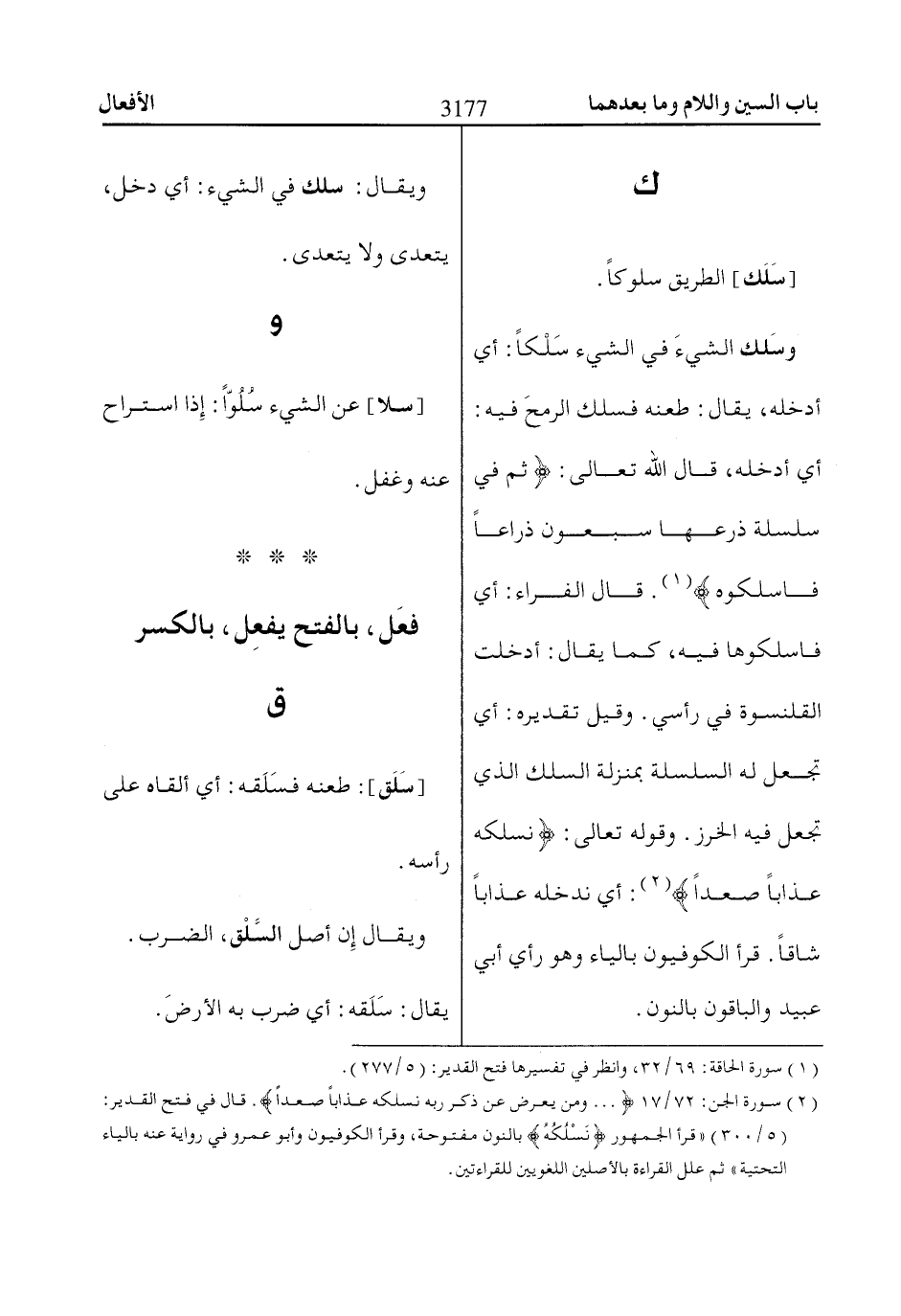 أي أدخله، قال الله تعالى: ثُمَّ فِي سِلْسِلَةٍ ذَرْعُهاا سَبْعُونَ ذِرااعاً فَاسْلُكُوهُ «1». قال الفراء: أي فاسلكوها فيه، كما يقال: أدخلت القلنسوة في رأسي. وقيل تقديره: أي تجعل له السلسلة بمنزلة السلك الذي تجعل فيه الخرز. وقوله تعالى: نسلكه عذابا صعدا «2»: أي ندخله عذاباً شاقاً. قرأ الكوفيون بالياء وهو رأي أبي عبيد والباقون بالنون.