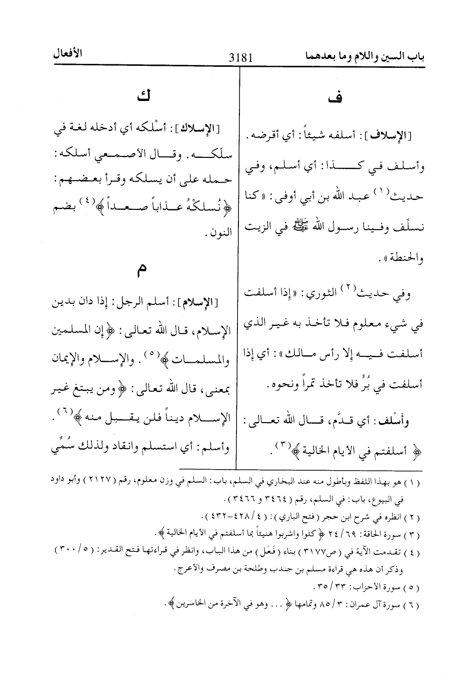 [الإِسلام]: أسلم الرجل: إِذا دان بدين الإِسلام، قال الله تعالى: إِنَّ الْمُسْلِمِينَ وَالْمُسْلِمااتِ «5». والإِسلام والإِيمان بمعنى، قال الله تعالى: وَمَنْ يَبْتَغِ غَيْرَ الْإِسْلاامِ دِيناً فَلَنْ يُقْبَلَ مِنْهُ «6».