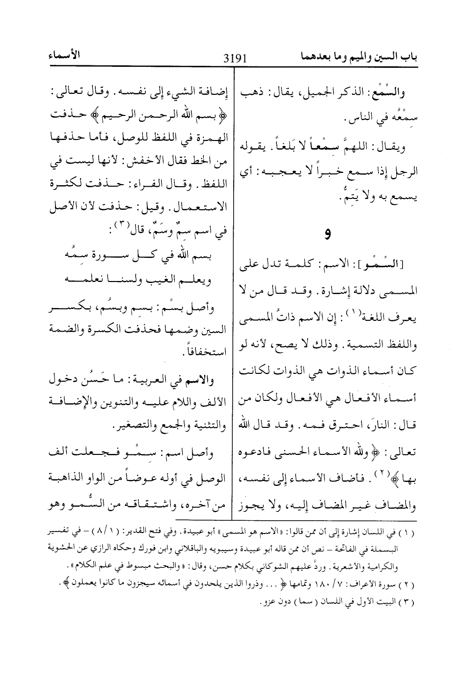(1) في اللسان إِشارة إِلى أن ممن قالوا: «الاسم هو المسمى» أبو عبيدة. وفي فتح القدير: (1/ 8) - في تفسير البسملة في الفاتحة- نص أن ممن قاله أبو عبيدة وسيبويه والباقلاني وابن فورك وحكاه الرازي عن الحشوية والكرامية والأشعرية. وردَّ عليهم الشوكاني بكلام حسن، وقال: «والبحث مبسوط في علم الكلام».
