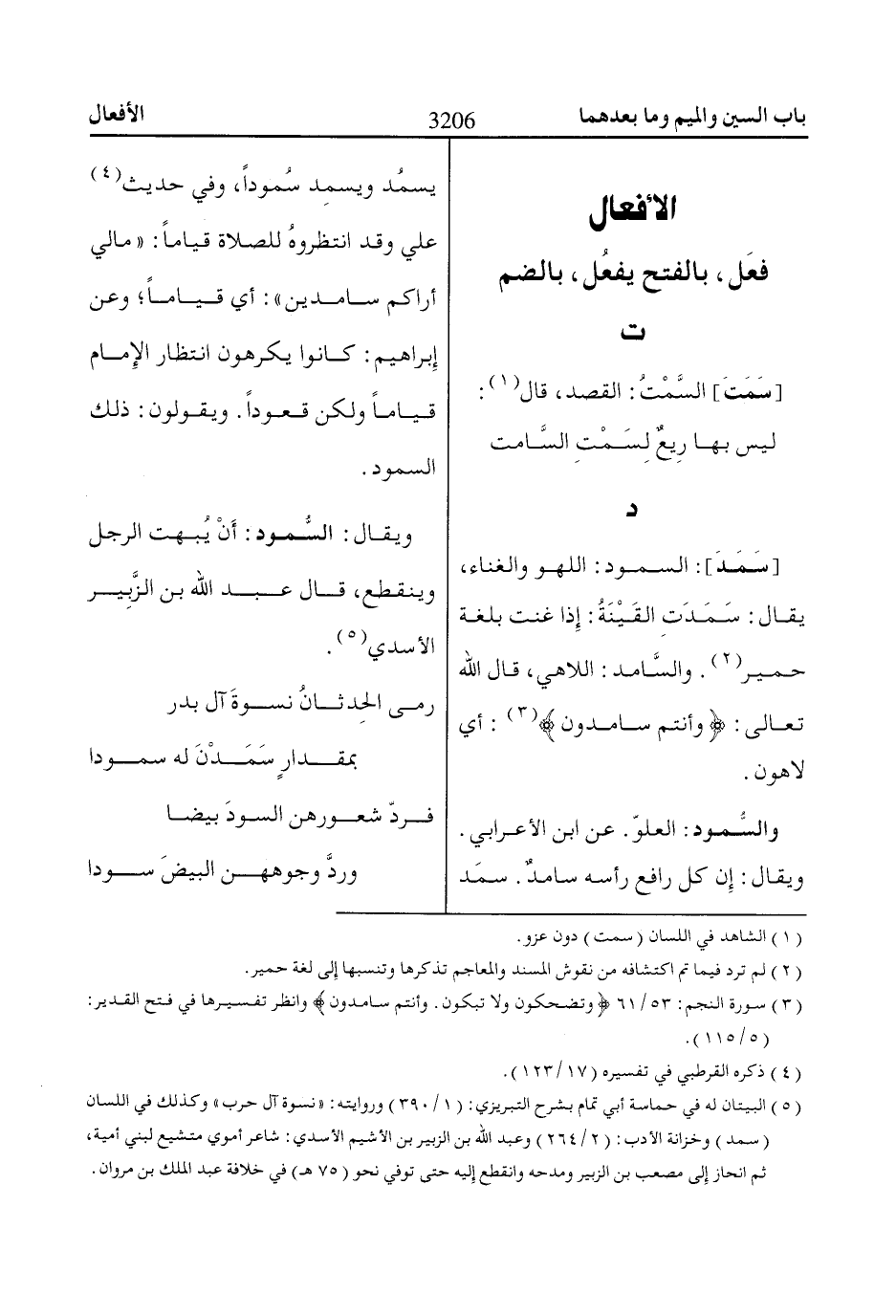 [سَمَدَ]: السمود: اللهو والغناء، يقال: سَمَدَتِ القَيْنَةُ: إِذا غنت بلغة حمير «2». والسَّامد: اللاهي، قال الله تعالى: وَأَنْتُمْ ساامِدُونَ «3»: أي لاهون.