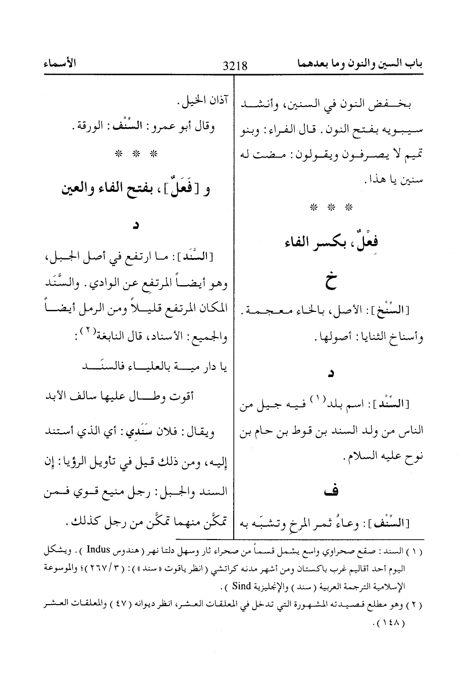 (1) السند: صقع صحراوي واسع يشمل قسماً من صحراء ثار وسهل دلتا نهر (هندوس Indus). ويشكل اليوم أحد أقاليم غرب باكستان ومن أشهر مدنه كراتشي (انظر ياقوت «سند»): (3/ 267)؛ والموسوعة الإِسلامية الترجمة العربية (سند) والإِنجليزية Sind).