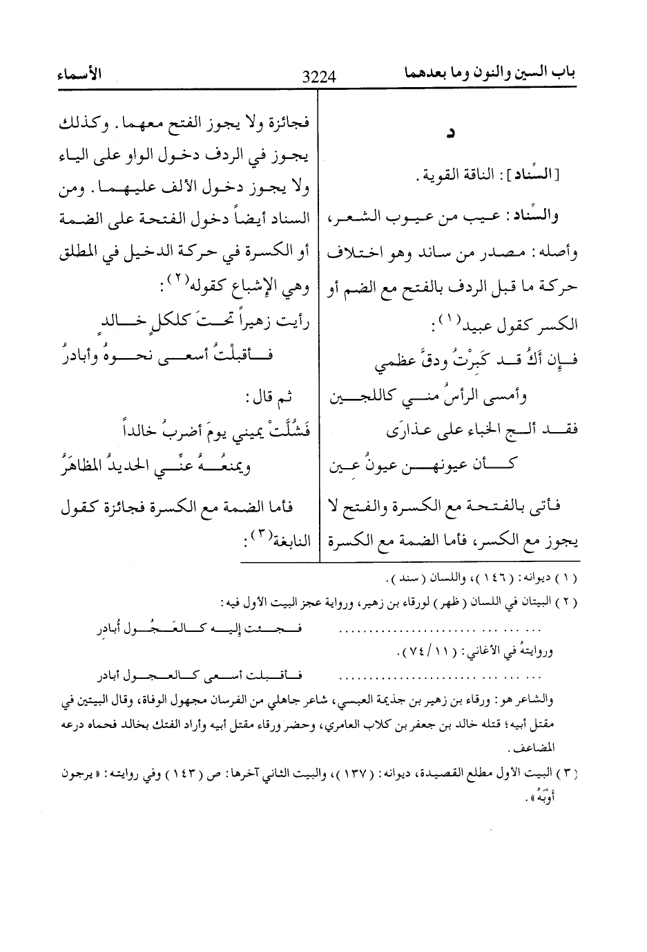 والسِّناد: عيب من عيوب الشعر، وأصله: مصدر من ساند وهو اختلاف حركة ما قبل الردف بالفتح مع الضم أو الكسر كقول عبيد «1»: