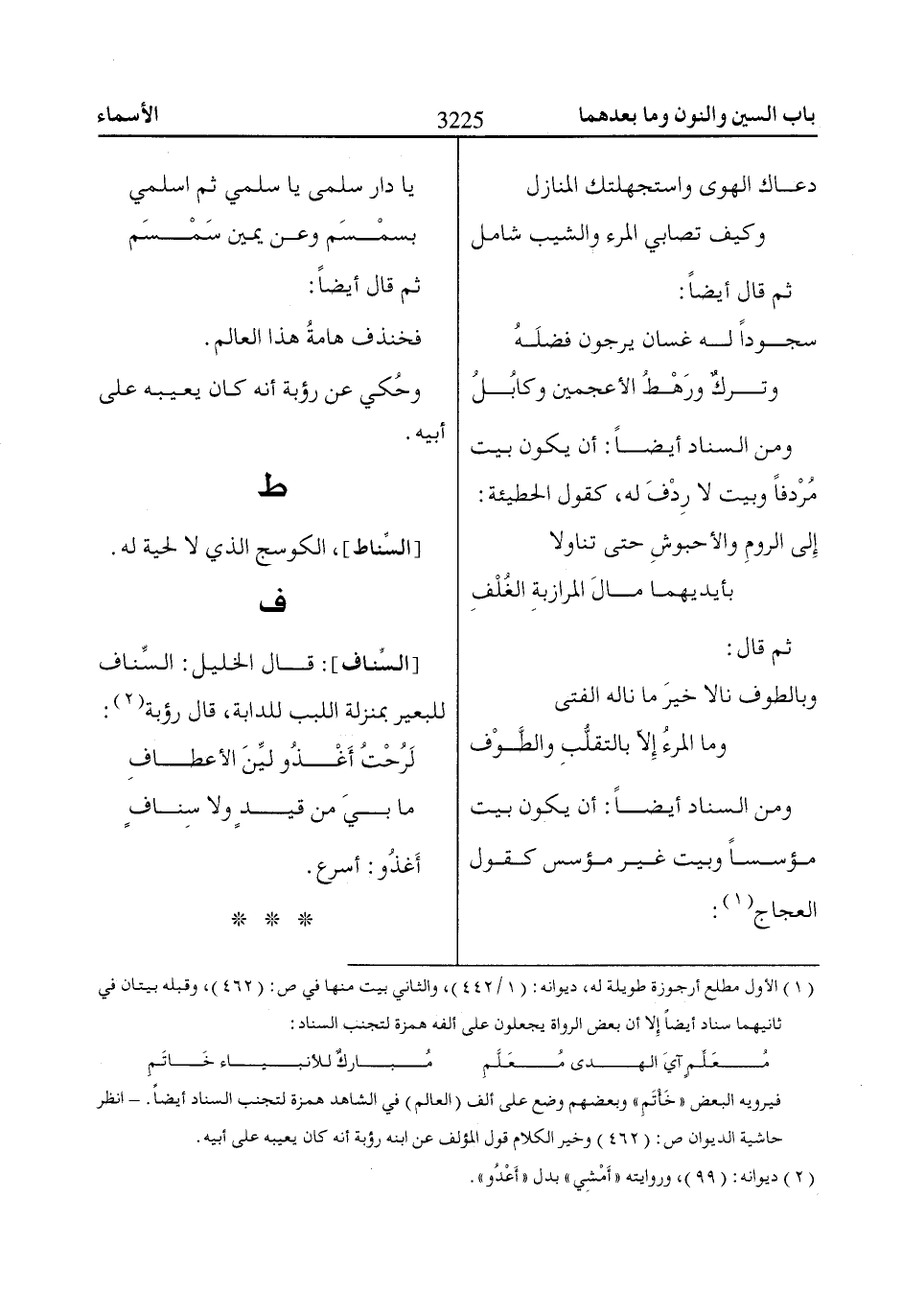 (1) الأول مطلع أرجوزة طويلة له، ديوانه: (1/ 442)، والثاني بيت منها في ص: (462)، وقبله بيتان في ثانيهما سناد أيضاً إِلا أن بعض الرواة يجعلون على ألفه همزة لتجنب السناد: