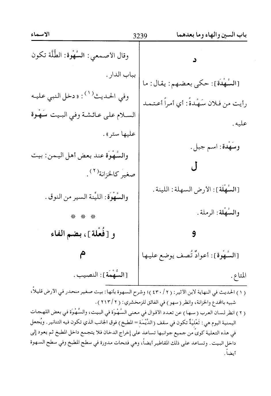 (2) انظر لسان العرب (سها) عن تعدد الأقوال في معنى السَّهْوَة في البيت، والسَّهْوَة في بعض اللهجات اليمنية اليوم هي: تَعْلِيَةٌ تكون في سقف (الدَّيْمَةِ- المطبخ) فوق الجانب الذي تكون فيه التنانير. ويُجعل في هذه التعلية كوىً من جميع جوانبها تساعد على إِخراج الدخان فلا يتجمع داخل المطبخ ثم يعود إِلى داخل البيت. وتساعد على ذلك المقاطير أيضاً، وهي فتحات مدورة في سطح المطبخ وفي سطح السهوة أيضاً.