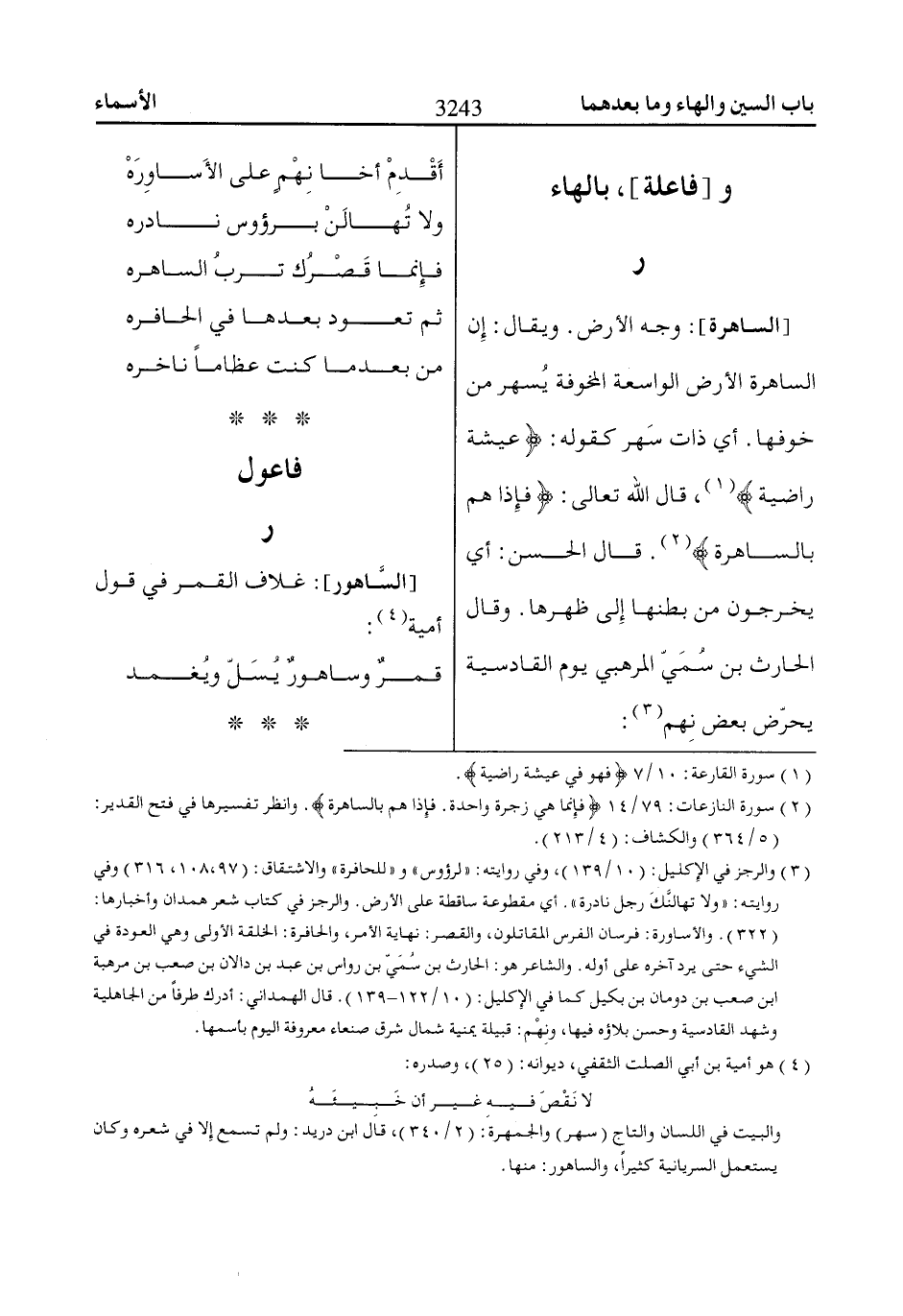 [الساهرة]: وجه الأرض. ويقال: إِن الساهرة الأرض الواسعة المخوفة يُسهر من خوفها. أي ذات سَهر كقوله: عِيشَةٍ رااضِيَةٍ* «1»، قال الله تعالى: فَإِذاا هُمْ بِالسّااهِرَةِ «2».