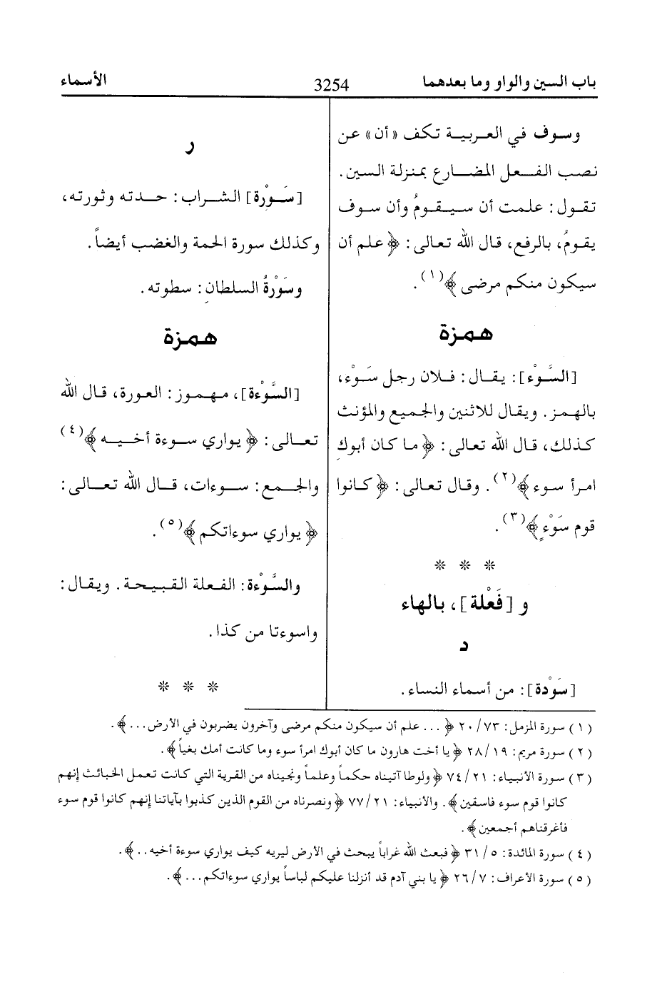 [السَّوْءة]، مهموز: العورة، قال الله تعالى: يُواارِي سَوْأَةَ أَخِيهِ «4» والجمع: سوءات، قال الله تعالى: