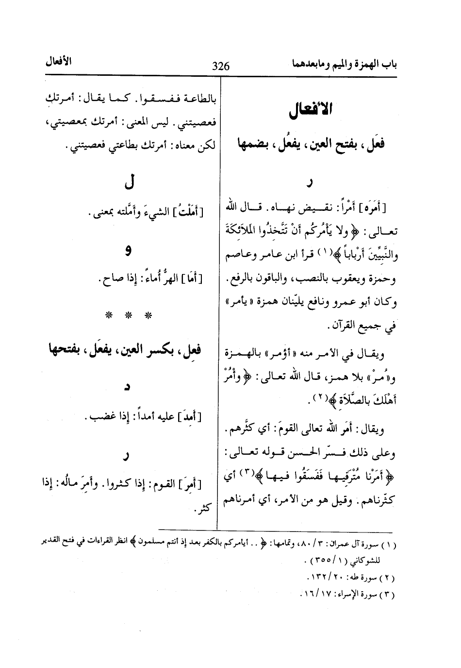 ويقال في الأمر منه «أؤمر» بالهمزة و «مُرْ» بلا همز، قال اللّاه تعالى: وَأْمُرْ أَهْلَكَ بِالصَّلااةِ «2».