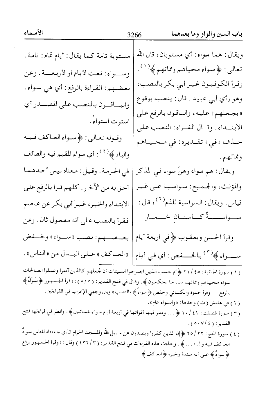 (1) سورة الجاثية: 45/ 21 أَمْ حَسِبَ الَّذِينَ اجْتَرَحُوا السَّيِّئااتِ أَنْ نَجْعَلَهُمْ كَالَّذِينَ آمَنُوا وَعَمِلُوا الصّاالِحااتِ سَوااءً مَحْيااهُمْ وَمَمااتُهُمْ سااءَ ماا يَحْكُمُونَ. وقال في فتح القدير: (5/ 8): «قرأ الجمهور سواء بالرفع ... وقرأ حمزة والكسائي وحفص سَوااءً بالنصب» وبين وجهي الإِعراب في القراءتين.