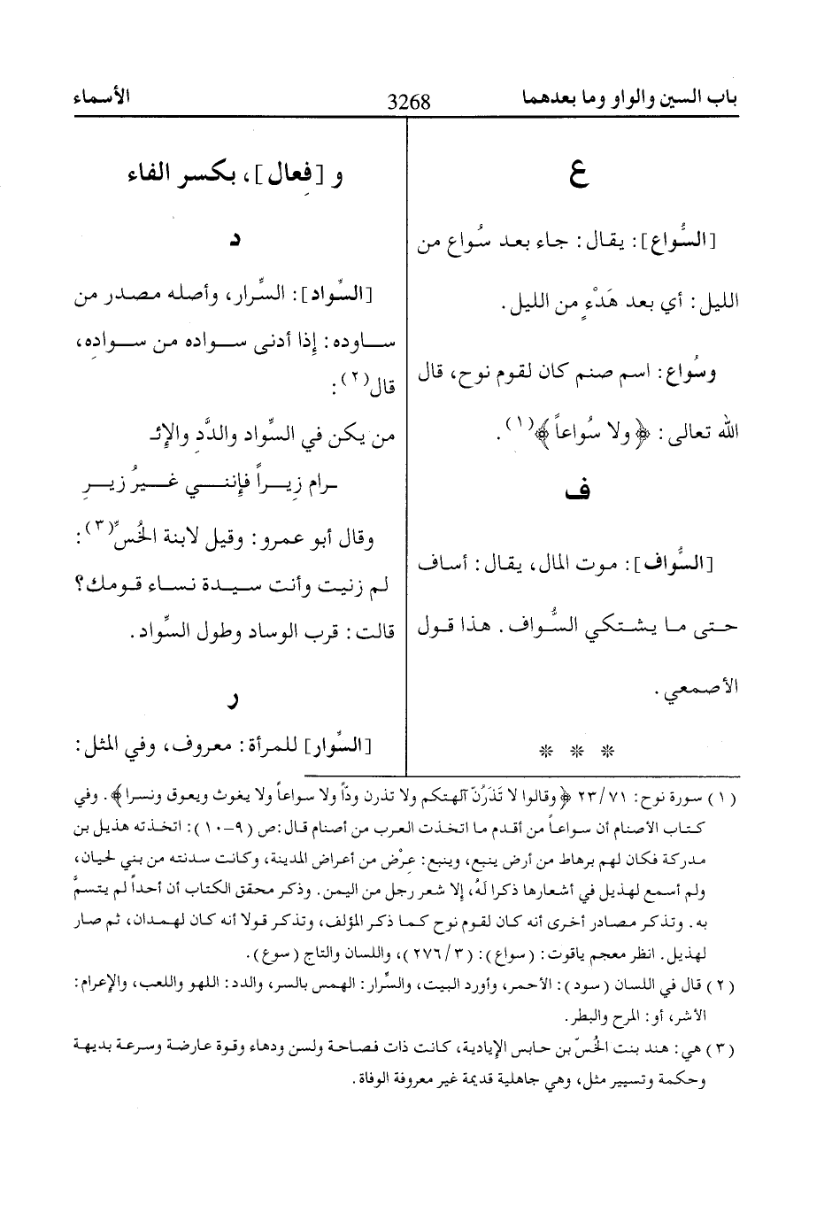 (1) سورة نوح: 71/ 23 وَقاالُوا لاا تَذَرُنَّ آلِهَتَكُمْ وَلاا تَذَرُنَّ وَدًّا وَلاا سُوااعاً وَلاا يَغُوثَ وَيَعُوقَ وَنَسْراً. وفي كتاب الأصنام أن سواعاً من أقدم ما اتخذت العرب من أصنام قال: ص (9 - 10): اتخذته هذيل بن مدركة فكان لهم برهاط من أرض ينبع، وينبع: عِرْض من أعراض المدينة، وكانت سدنته من بني لحيان، ولم أسمع لهذيل في أشعارها ذكرا لهُ، إِلا شعر رجل من اليمن. وذكر محقق الكتاب أن أحداً لم يتشمَّ به. وتذكر مصادر أخرى أنه كان لقوم نوح كما ذكر المؤلف، وتذكر قولا أنه كان لهمدان، ثم صار لهذيل. انظر معجم ياقوت: (سواع): (3/ 276)، واللسان والتاج (سوع).