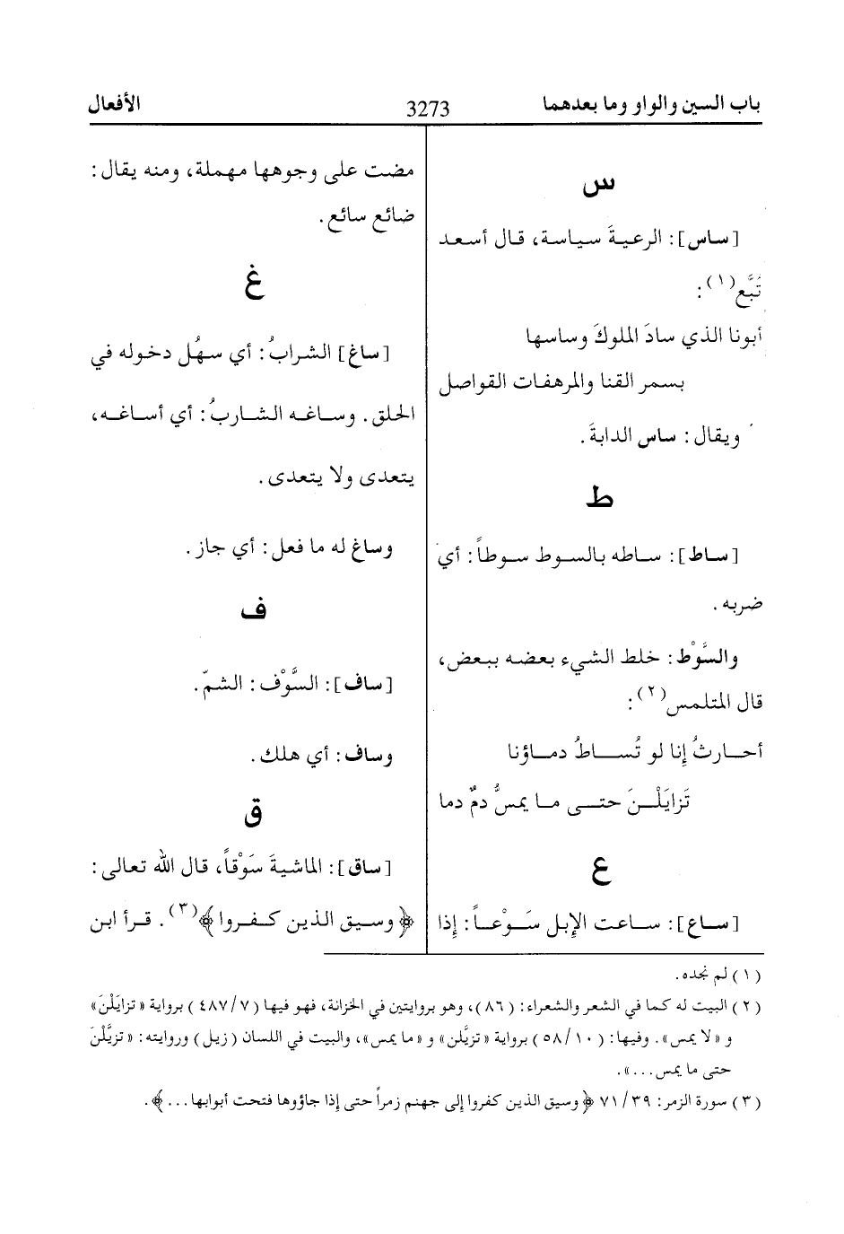 [ساغ] الشرابُ: أي سهُل دخوله في الحلق. وساغه الشاربُ: أي أساغه، يتعدى ولا يتعدى.