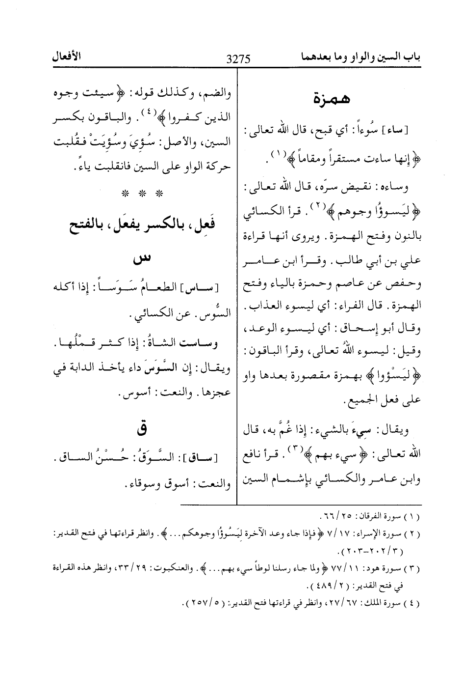 ويقال: سِيءَ بالشيء: إِذا غُمَّ به، قال الله تعالى: سِيءَ بِهِمْ* «3». قرأ نافع وابن عامر والكسائي بإِشمام السين والضم، وكذلك قوله: سِيئَتْ وُجُوهُ الَّذِينَ كَفَرُوا «4». والباقون بكسر السين، والأصل: سُؤِيَ وسُؤِيَتْ فقُلبت حركة الواو على السين فانقلبت ياءً.