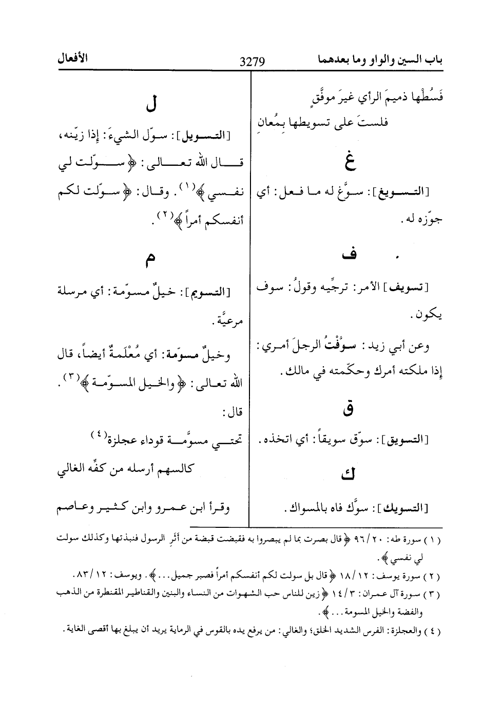 [التسويل]: سوّل الشيءَ: إِذا زيّنه، قال الله تعالى: سَوَّلَتْ لِي نَفْسِي «1». وقال: سَوَّلَتْ لَكُمْ أَنْفُسُكُمْ أَمْراً* «2».