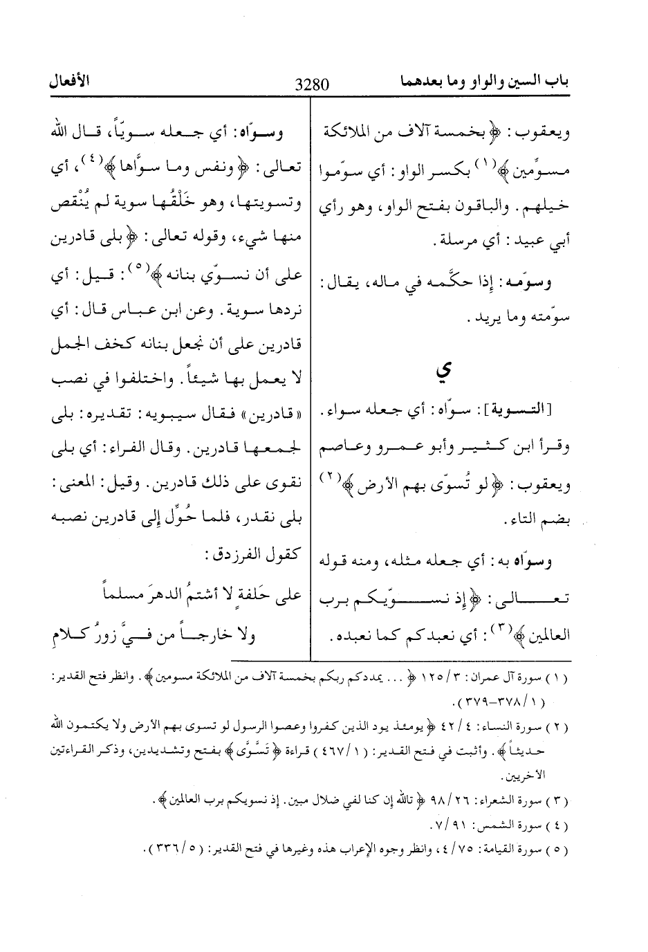 وسوّاه: أي جعله سويّاً، قال الله تعالى: وَنَفْسٍ وَماا سَوّااهاا «4»، أي وتسويتها، وهو خَلْقُها سوية لم يُنْقص منها شيء، وقوله تعالى: بَلى قاادِرِينَ عَلى أَنْ نُسَوِّيَ بَناانَهُ «5»: قيل: أي نردها سوية.