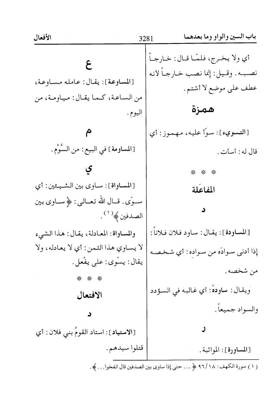 [المساواة]: ساوى بين الشيئين: أي سوّى. قال الله تعالى: سااوى بَيْنَ الصَّدَفَيْنِ «1».