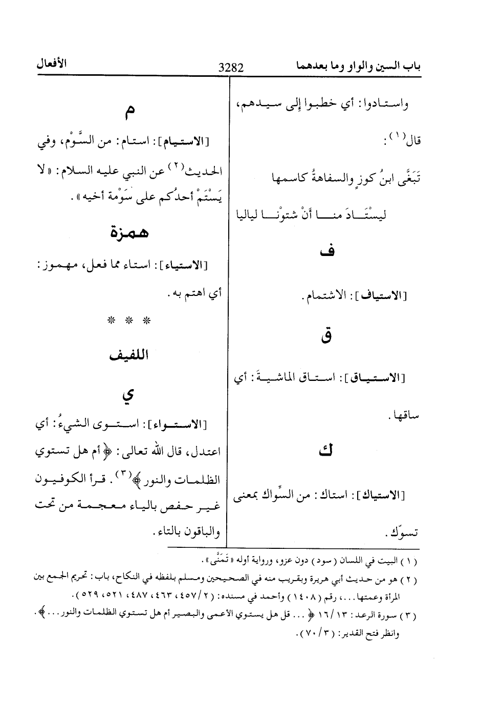[الاستواء]: استوى الشيءُ: أي اعتدل، قال الله تعالى: أَمْ هَلْ تَسْتَوِي الظُّلُمااتُ وَالنُّورُ «3». قرأ الكوفيون غير حفص بالياء معجمة من تحت والباقون بالتاء.