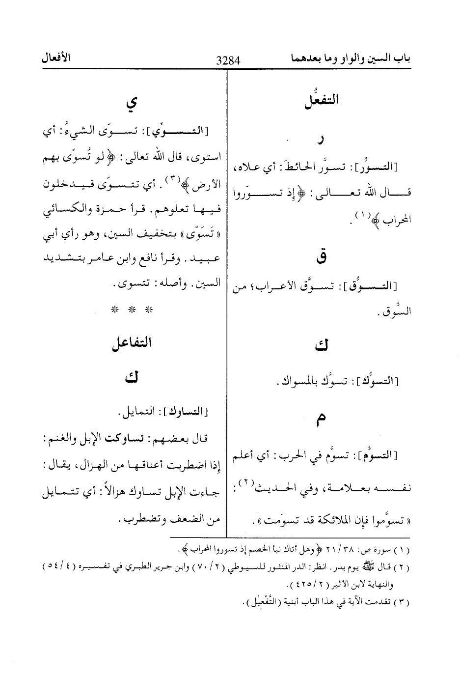 [التسوِّي]: تسوّى الشيءُ: أي استوى، قال الله تعالى: لَوْ تُسَوّاى بِهِمُ الْأَرْضُ «3». أي تتسوّى فيدخلون فيها تعلوهم. قرأ حمزة والكسائي «تَسَوّى» بتخفيف السين، وهو رأي أبي عبيد. وقرأ نافع وابن عامر بتشديد السين. وأصله: تتسوى.