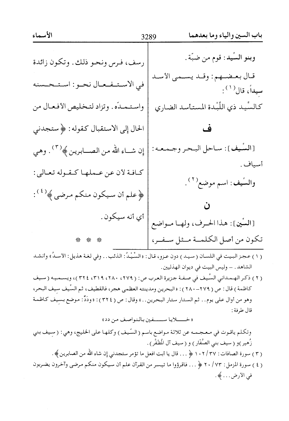 [السِّين]: هذا الحرف، ولها مواضع تكون من أصل الكلمة مثل سفر، رسف، فرس ونحو ذلك. وتكون زائدة في الاستفعال نحو: استحسنه واستمدّه. وتزاد لتخليص الأفعال من الحال إِلى الاستقبال كقوله: سَتَجِدُنِي إِنْ شااءَ اللّاهُ مِنَ الصّاابِرِينَ «3». وهي كافة لأن عن عملها كقوله تعالى: