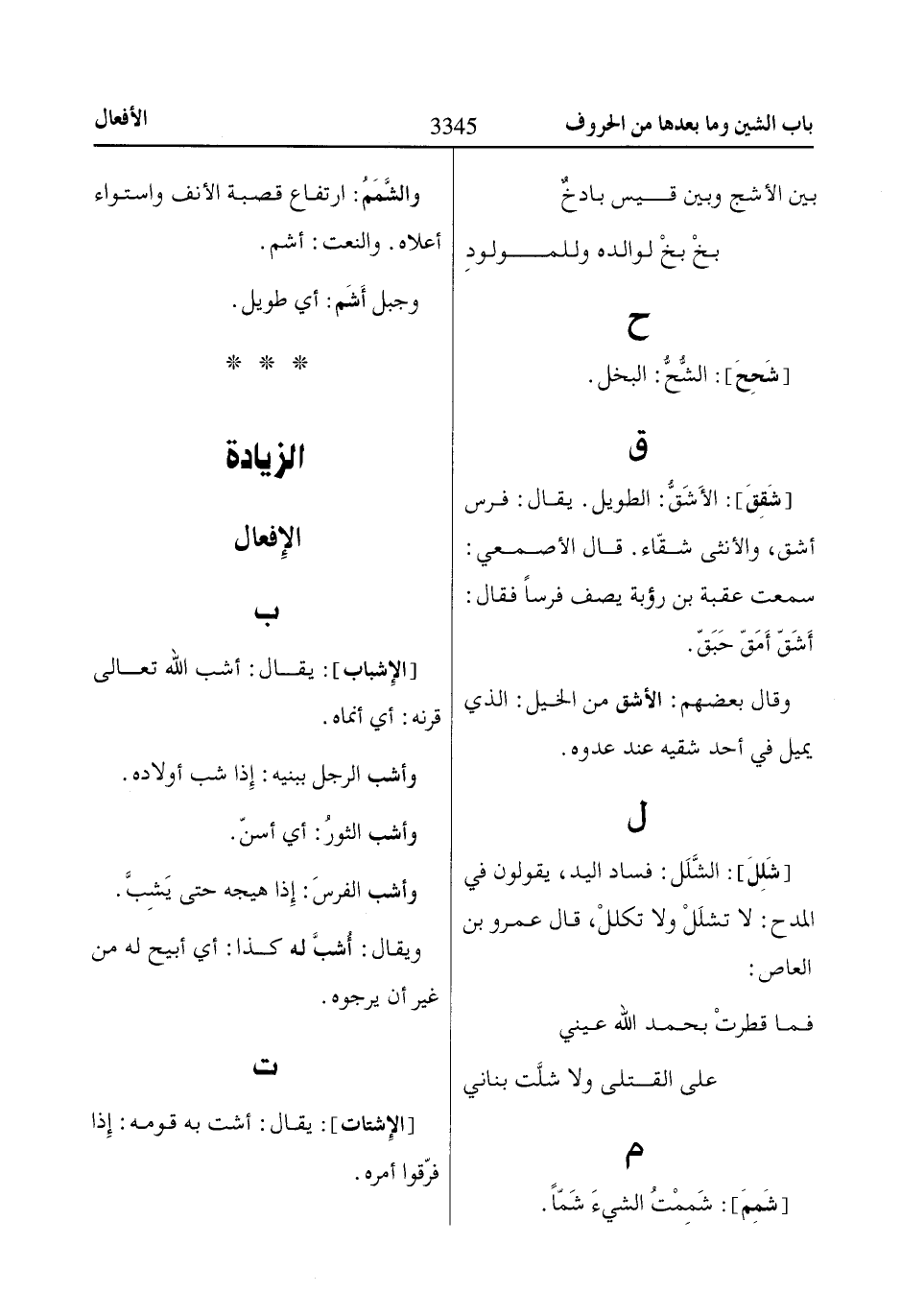 [شَقِقَ]: الأَشَقُّ: الطويل. يقال: فرس أشق، والأنثى شقّاء. قال الأصمعي: