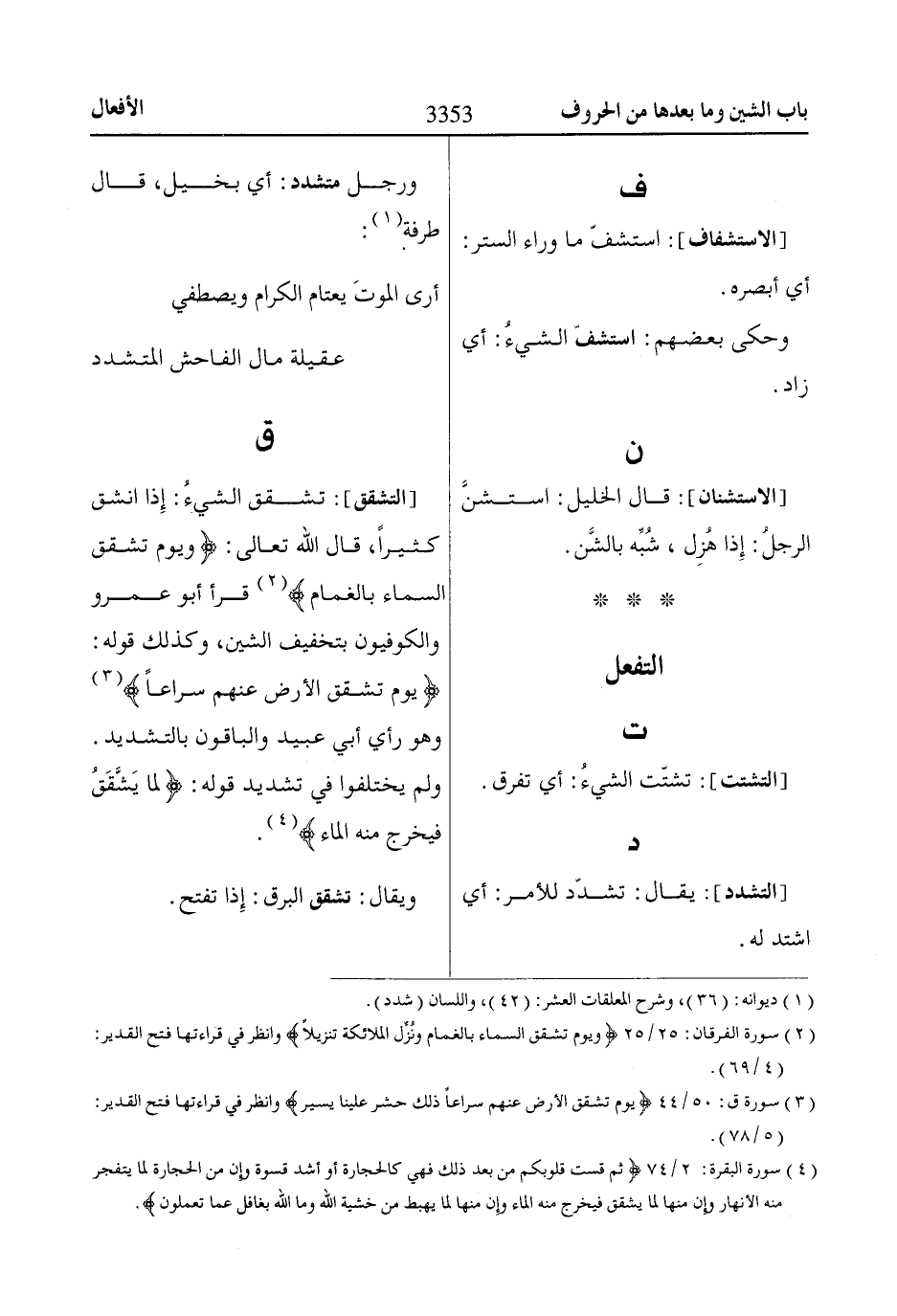 [التشقق]: تشقق الشيءُ: إِذا انشق كثيراً، قال اللّاه تعالى: وَيَوْمَ تَشَقَّقُ السَّمااءُ بِالْغَماامِ «2» قرأ أبو عمرو والكوفيون بتخفيف الشين، وكذلك قوله: