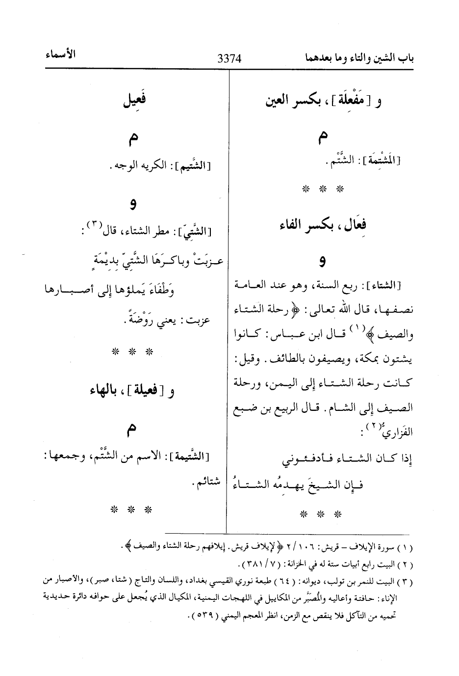 (3) البيت للنمر بن تولب، ديوانه: (64) طبعة نوري القيسي بغداد، واللسان والتاج (شتا، صبر)، والأصبار من الإِناء: حافتة وأعاليه والمُصَبَّر من المكاييل في اللهجات اليمنية، المكيال الذي يُجعل على حوافه دائرة حديدية تحميه من التآكل فلا ينقص مع الزمن، انظر المعجم اليمني (539).