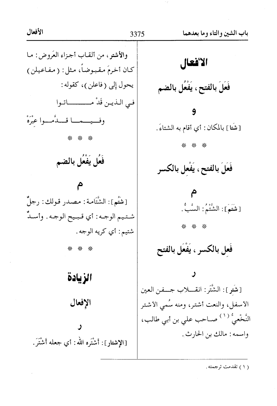 [شَتِر]: الشَّتَر: انقلاب جفن العين الأسفل، والنعت أشتر، ومنه سُمي الأشتر النَّخْعيُّ «1» صاحب علي بن أبي طالب، واسمه: مالك بن الحارث.