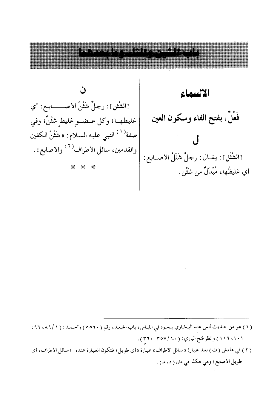 [الشَّثن]: رجلٌ شَثْنُ الأصابع: أي غليظها؛ وكل عضوٍ غليظٍ شَثْنٌ؛