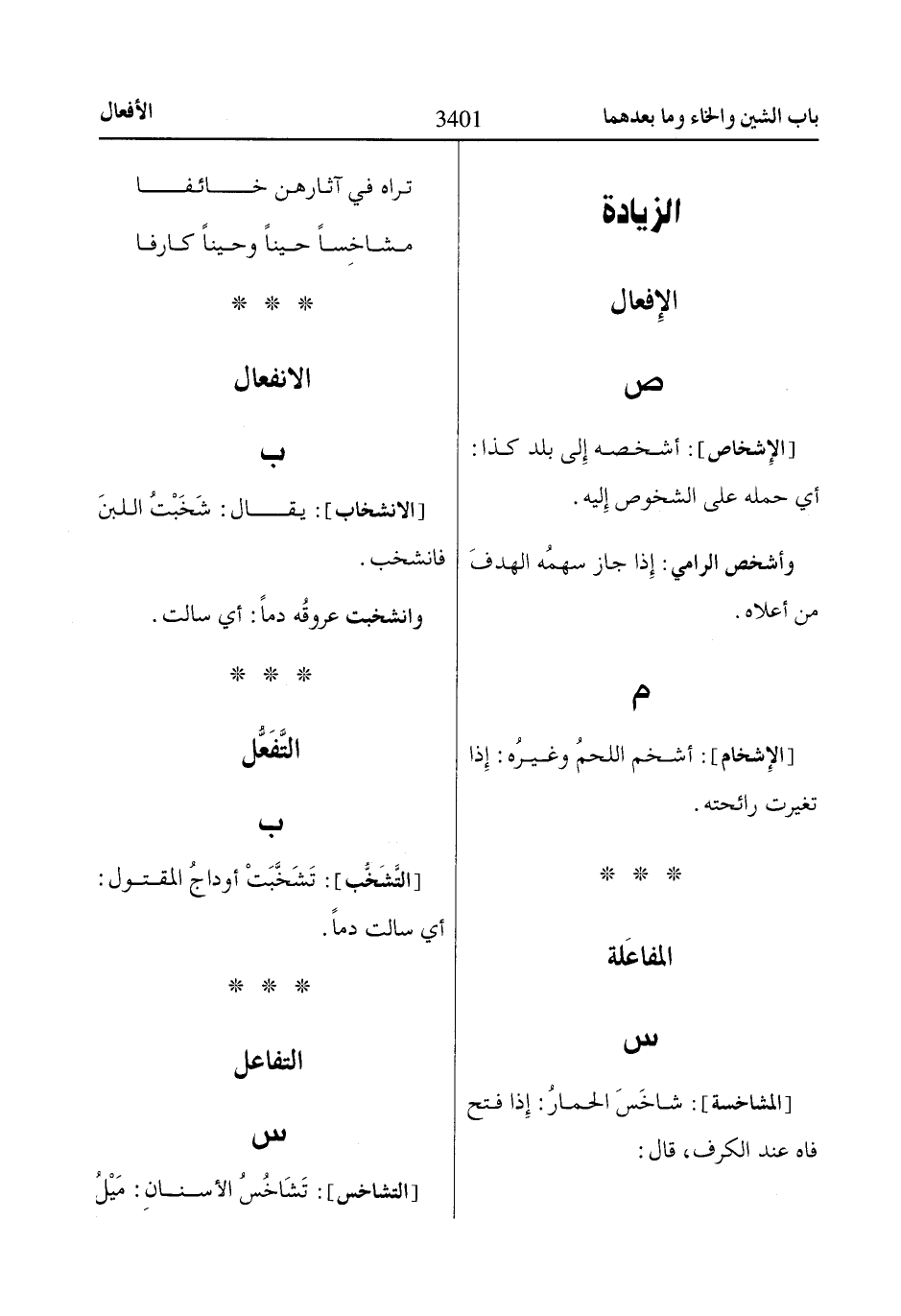 [المشاخسة]: شاخَسَ الحمارُ: إِذا فتح فاه عند الكرف، قال: