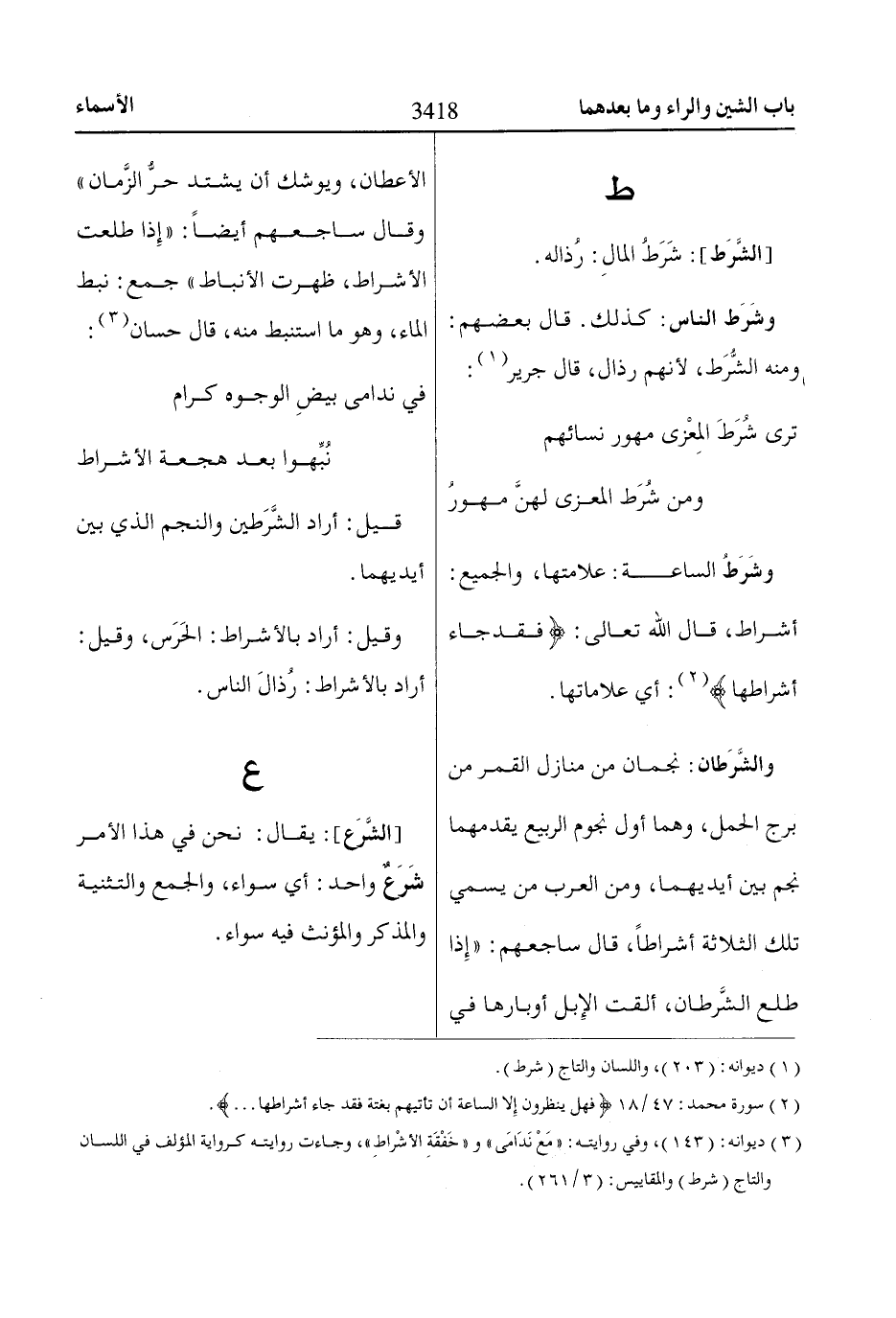 والشَّرَطان: نجمان من منازل القمر من برج الحمل، وهما أول نجوم الربيع يقدمهما نجم بين أيديهما، ومن العرب من يسمي تلك الثلاثة أشراطاً، قال ساجعهم: «إِذا طلع الشَّرطان، ألقت الإِبل أوبارها في الأعطان، ويوشك أن يشتد حرُّ الزَّمان» وقال ساجعهم أيضاً: «إِذا طلعت الأشراط، ظهرت الأنباط» جمع: نبط الماء، وهو ما استنبط منه، قال حسان «3»: