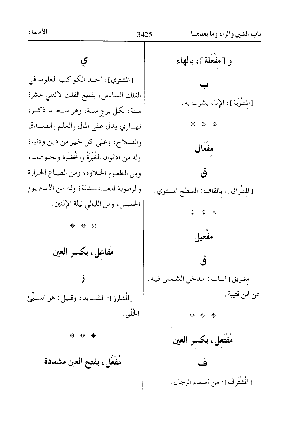 [المشتري]: أحد الكواكب العلوية في الفلك السادس، يقطع الفلك لاثنتي عشرة سنة، لكل برجٍ سنة، وهو سعد ذكر، نهاري يدل على المال والعلم والصدق والصلاح، وعلى كل خير من دين ودنيا؛ وله من الألوان الغُبْرَةُ والخُضْرة ونحوهما؛ ومن الطعوم الحلاوة؛ ومن الطباع الحرارة والرطوبة المعتدلة؛ وله من الأيام يوم الخميس، ومن الليالي ليلة الإِثنين.