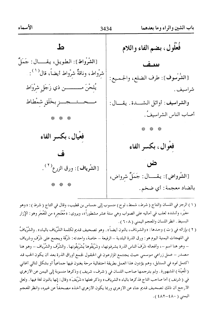 (2) بإِزائه في (ت) وحدها: «والشرناف، بالنون أيضاً». وهو تصحيف قديم لكلمة الشِّرْياف بالياء». والشِّرْيافُ في اللهجات اليمنية اليوم هو: ورق الذرة البلدية- الرفيعة- خاصة، واحدته: شَرْفَة ويجمع على شَرْفٍ وشرياف- وهو هنا اسم-، وأفعاله شَرَفَ الناس الذرة يشرفونها، وشَرْيَفُوها يُشَرْيِفُونها. والشَّرْف والشِّرْياف- وهو هنا مصدر- عمل زراعي موسمي حيث يجتمع المزارعون في الحقول لجمع أوراق الذرة بعد أن يكون الحب قد اكتمل نموه في السنابل، وهم يؤدون هذا العمل بطريقة احتفالية مرحة يغنون فيها جماعياًّ أو بشكل ثنائي أغاني (المُعِيْنَة) المشهورة. ولم يترجمها صاحب اللسان في (شرف، شريف) وذكرها منسوبة إِلى اليمن عن الأزهري في (شرنف) أما صاحب التاج فذكرها بالياء «الشرياف» وذكر فعلها «شَرْيَفَ» وقال: إِنها بالنون لغة فيها. ولعل الأرجح أن ذلك تصحيف قديم جاء عن الأزهري وربما يكون الأزهري وربما يكون الأزهري أخذه مصحفاً عن غيره، وانظر المعجم اليمني (480 - 482).
