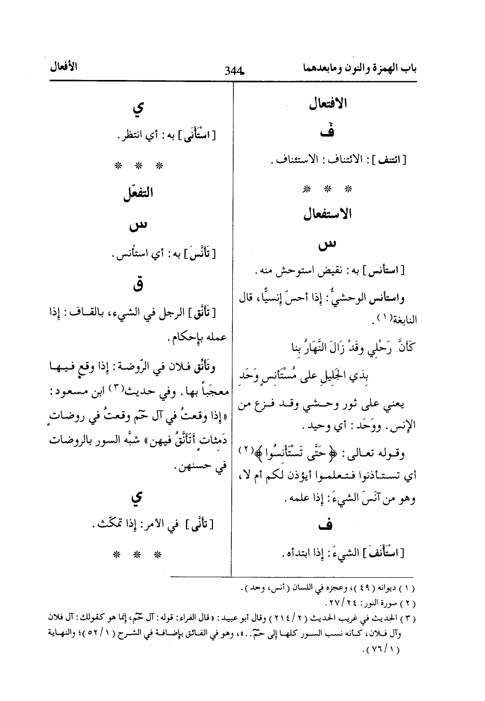 واستأنس الوحشيُّ: إِذا أحسّ إِنسيًّا، قال النابغة «1».