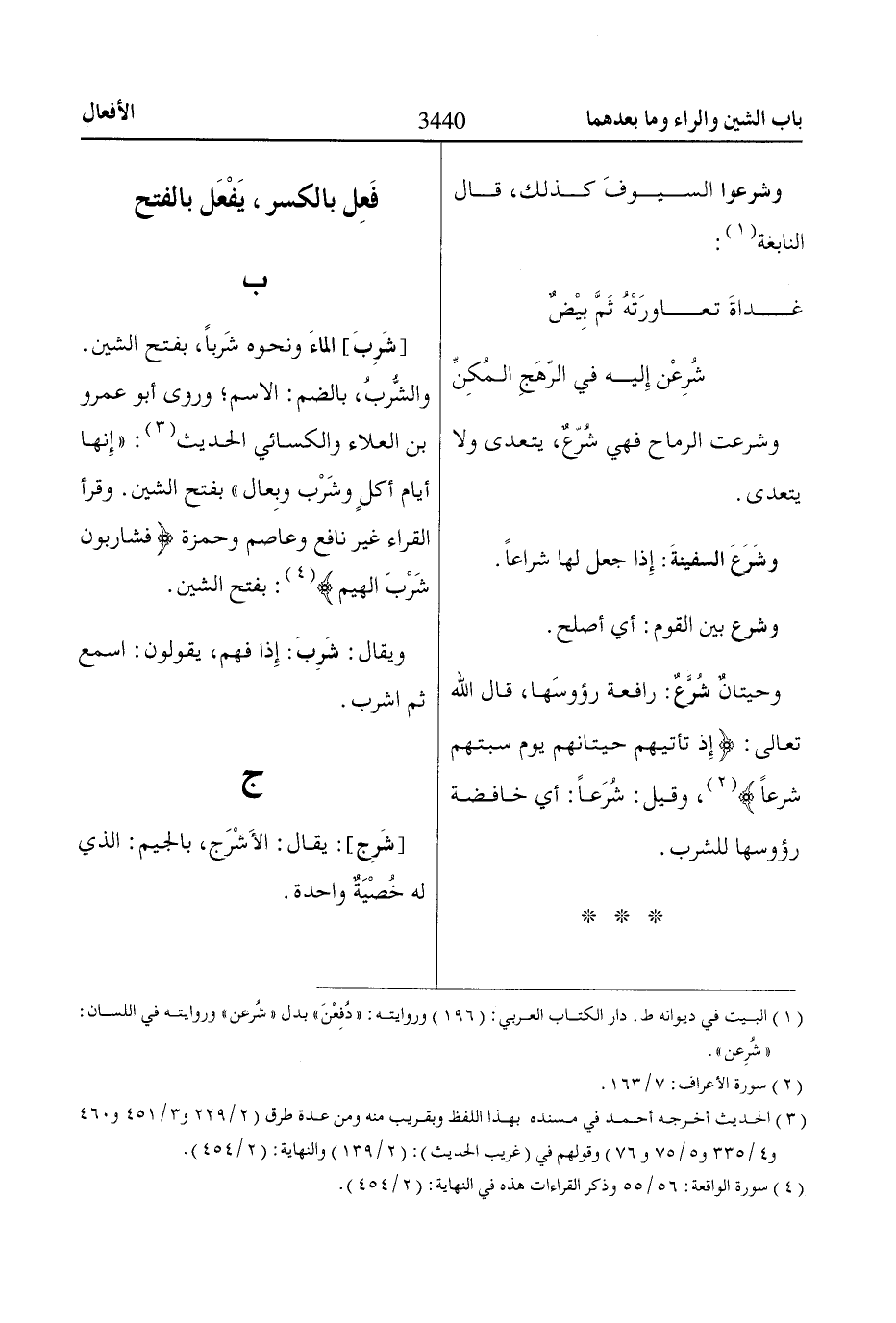 وحيتانٌ شُرَّعٌ: رافعة رؤوسَها، قال اللّاه تعالى: إِذْ تَأْتِيهِمْ حِيتاانُهُمْ يَوْمَ سَبْتِهِمْ شُرَّعاً «2»، وقيل: شُرَّعاً: أي خافضة رؤوسها للشرب.