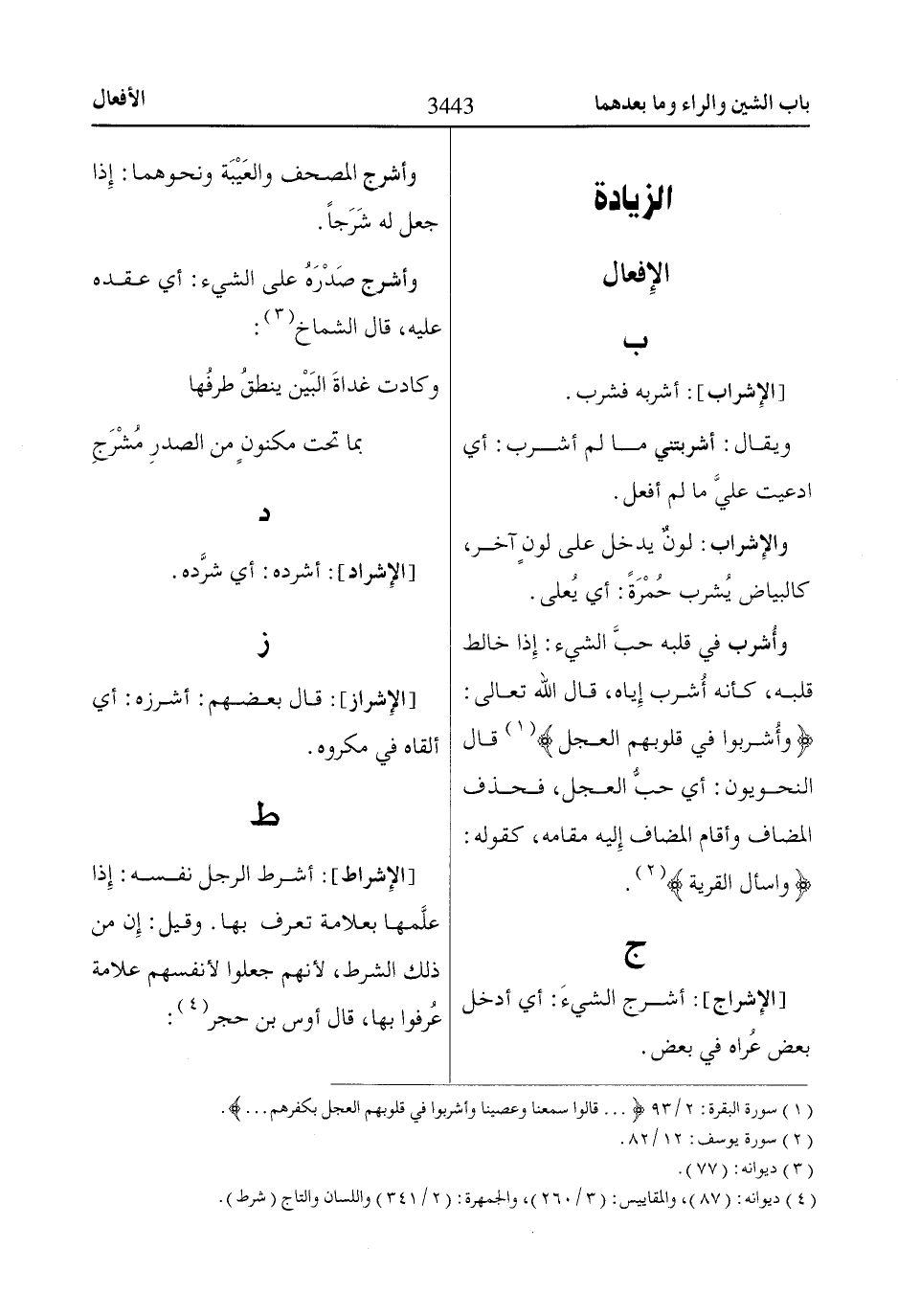 وَأُشْرِبُوا فِي قُلُوبِهِمُ الْعِجْلَ «1» قال النحويون: أي حبُّ العجل، فحذف المضاف وأقام المضاف إِليه مقامه، كقوله: