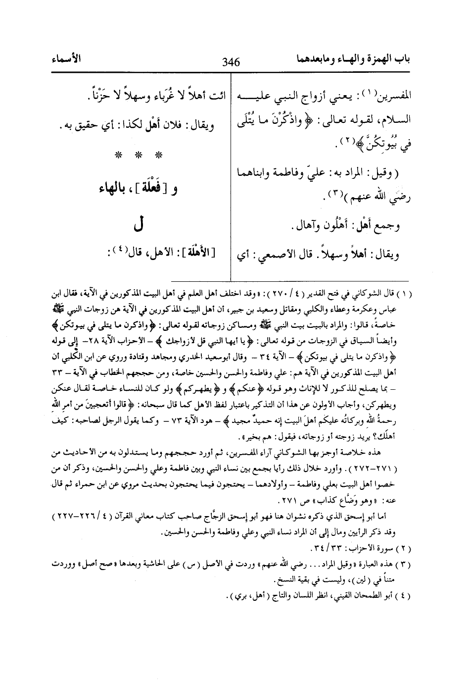 (1) قال الشوكاني في فتح القدير (4/ 270): «وقد اختلف أهل العلم في أهل البيت المذكورين في الآية، فقال ابن عباس وعكرمة وعطاء والكلبي ومقاتل وسعيد بن جبير، أن أهل البيت المذكورين في الآية هن زوجات النبي صَلى الله عَليه وسلم خاصةً، قالوا: والمراد بالبيت بيت النبي صَلى الله عَليه وسلم ومساكن زوجاته لقوله تعالى: وَاذْكُرْنَ ماا يُتْلى فِي بُيُوتِكُنَّ وأيضاً السياق في الزوجات من قوله تعالى: ياا أَيُّهَا النَّبِيُّ قُلْ لِأَزْوااجِكَ- الأحزاب الآية 28 - إِلى قوله وَاذْكُرْنَ ماا يُتْلى فِي بُيُوتِكُنَّ- الآية 34 - وقال أبو سعيد الخدري ومجاهد وقتادة وروي عن ابن الكلبي أن أهل البيت المذكورين في الآية هم: علي وفاطمة والحسن والحسين خاصة، ومن حججهم الخطاب في الآية- 33 - بما يصلح للذكور لا للإِناث وهو قوله عَنْكُمُ ويُطَهِّرَكُمْ ولو كان للنساء خاصة لقال عنكن ويطهركن، وأجاب الأولون عن هذا أن التذكير باعتبار لفظ الأهل كما قال سبحانه: قاالُوا أَتَعْجَبِينَ مِنْ أَمْرِ اللّاهِ رَحْمَتُ اللّاهِ وَبَرَكااتُهُ عَلَيْكُمْ أَهْلَ الْبَيْتِ إِنَّهُ حَمِيدٌ مَجِيدٌ- هود الآية 73 - وكما يقول الرجل لصاحبه: كيف أهلَك؟ يريد زوجته أو زوجاته، فيقول: هم بخير».