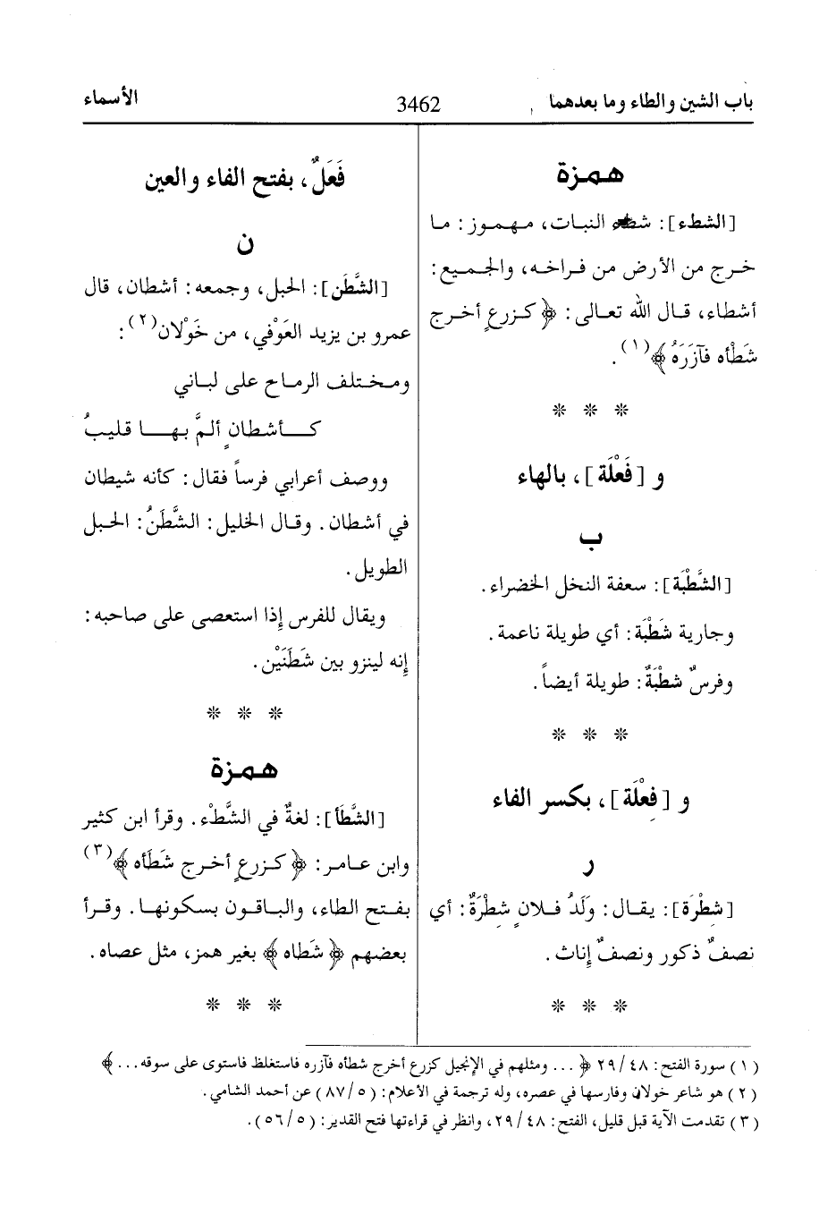 [الشَّطَأ]: لغةٌ في الشَّطْء. وقرأ ابن كثير وابن عامر: كزرع أخرج شَطَأَهُ «3» بفتح الطاء، والباقون بسكونها. وقرأ بعضهم شَطَاهُ بغير همز، مثل عصاه.