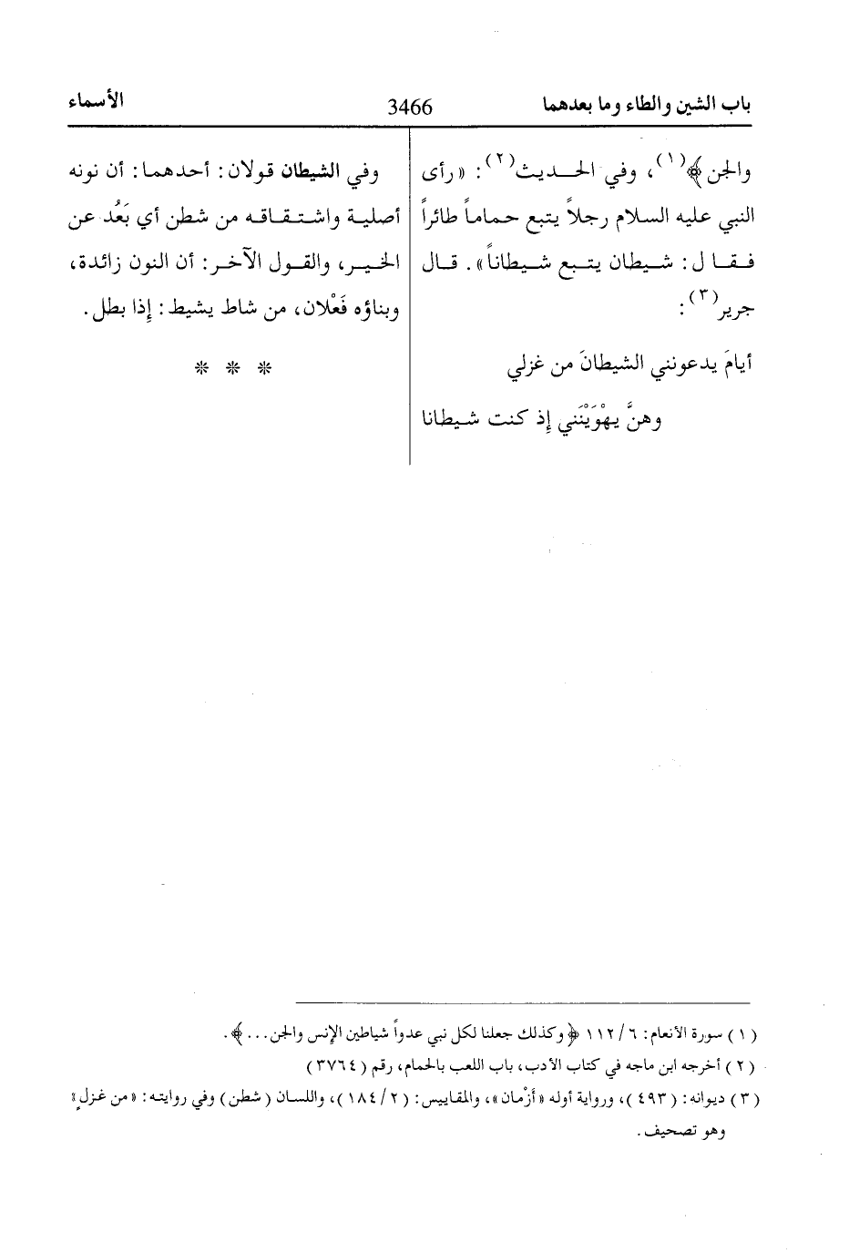 وفي الشيطان قولان: أحدهما: أن نونه أصلية واشتقاقه من شطن أي بَعُد عن الخير، والقول الآخر: أن النون زائدة، وبناؤه فَعْلان، من شاط يشيط: إِذا بطل.