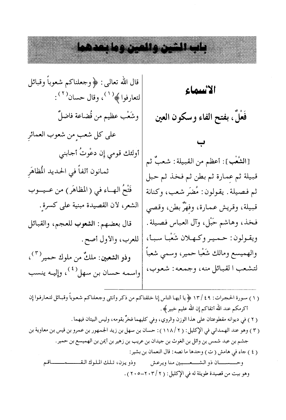 [الشَّعْب]: أعظم من القبيلة: شعبٌ ثم قبيلة ثم عِمارة ثم بطن ثم فخذ ثم حبل ثم فصيلة. يقولون: مُضَر شعب، وكنانة قبيلة، وقريش عمارة، وفِهْرٌ بطن، وقصي فخذ، وهاشم حَبْل، وآل العباس فصيلة.