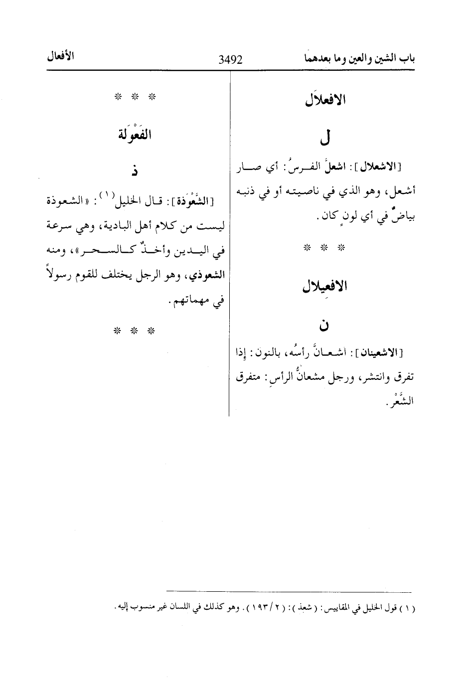 (1) قول الخليل في المقاييس: (شعذ): (2/ 193). وهو كذلك في اللسان غير منسوب إِليه.