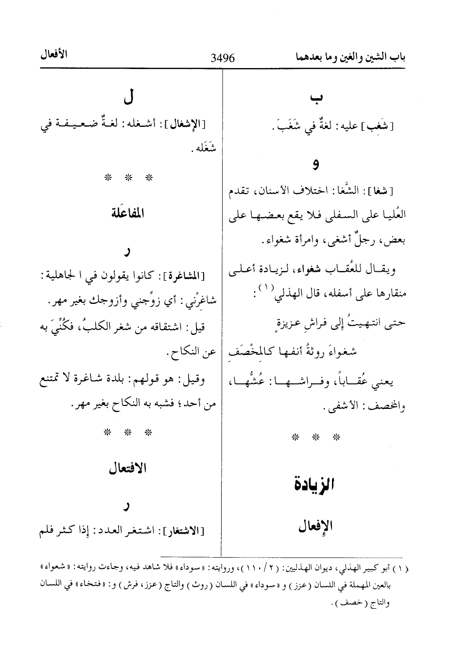 (1) أبو كبير الهذلي، ديوان الهذليين: (2/ 110)، وروايته: «سوداء» فلا شاهد فيه، وجاءت روايته: «شعواء» بالعين المهملة في اللسان (عزز) و «سوداء» في اللسان (روث) والتاج (عزز، فرش) و: «فتخاء» في اللسان والتاج (خصف).