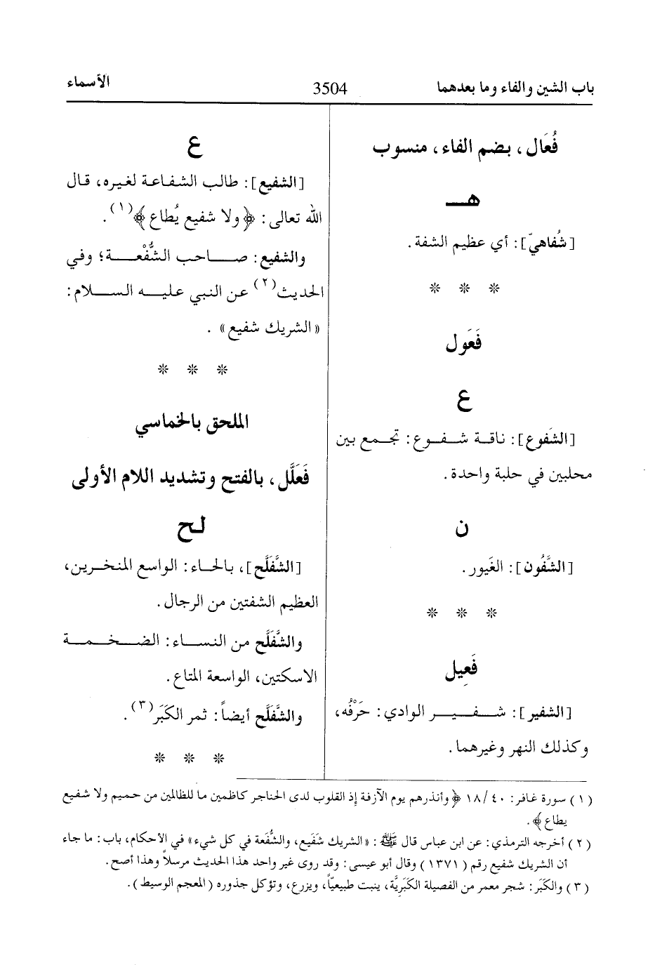 [الشفيع]: طالب الشفاعة لغيره، قال اللّاه تعالى: وَلاا شَفِيعٍ يُطااعُ «1».