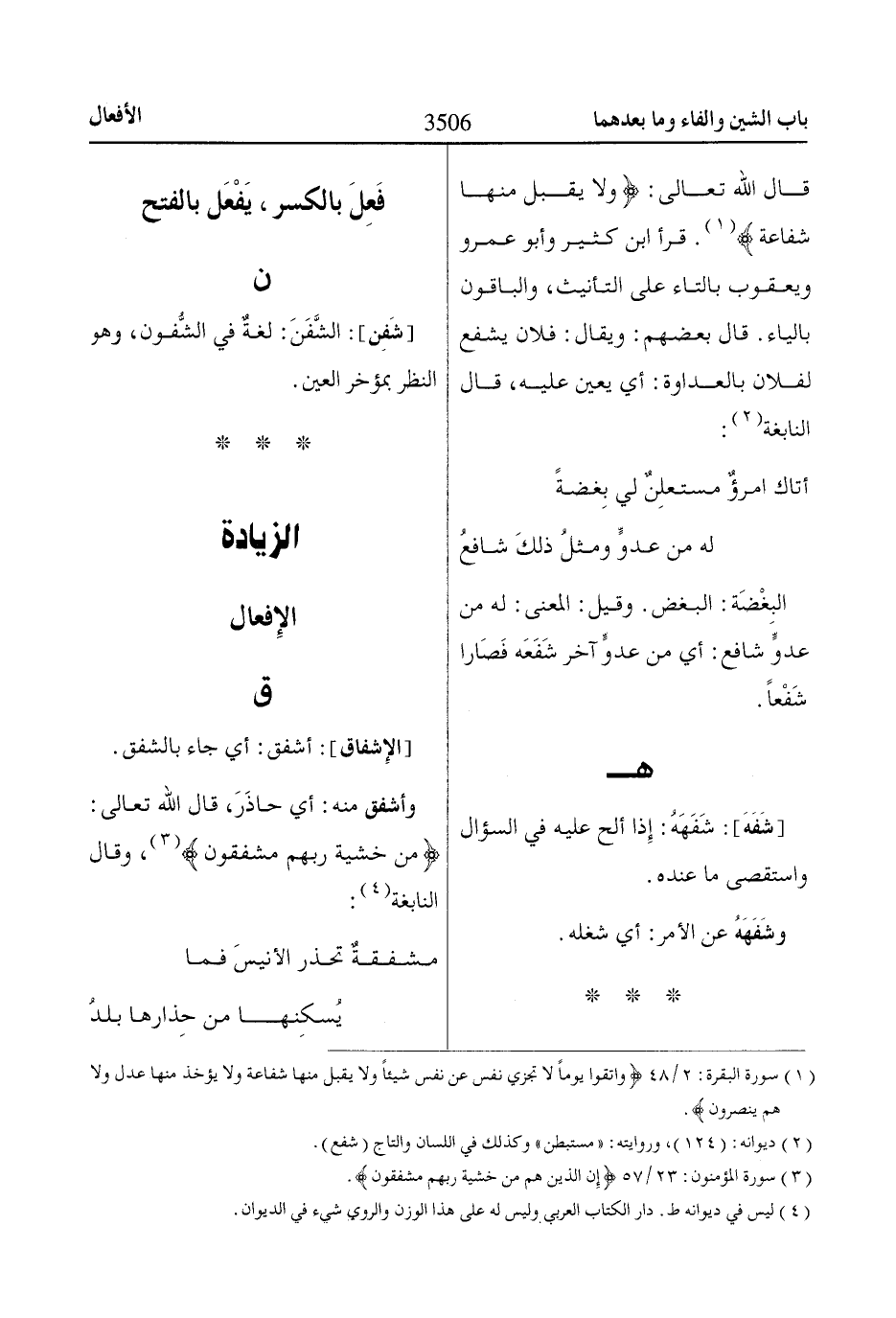 قال اللّاه تعالى: وَلاا يُقْبَلُ مِنْهاا شَفااعَةٌ «1». قرأ ابن كثير وأبو عمرو ويعقوب بالتاء على التأنيث، والباقون بالياء. قال بعضهم: ويقال: فلان يشفع لفلان بالعداوة: أي يعين عليه، قال النابغة «2»: