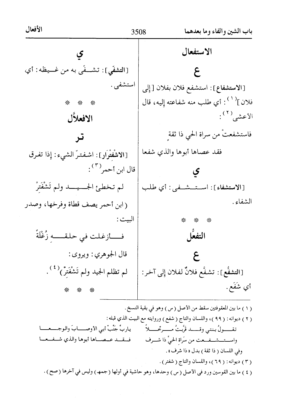 [الاستشفاع]: استشفع فلان بفلان [إِلى فلان] «1»: أي طلب منه شفاعته إِليه، قال الأعشى «2»:
