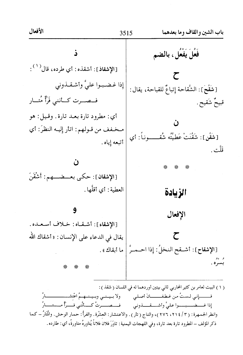 (1) البيت لعامر بن كثير المحاربي ثاني بيتين أوردهما له في اللسان (شقذ):