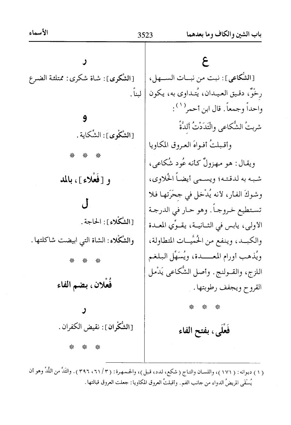 [الشُّكاعى]: نبت من نبات السهل، رِخْوٌ، دقيق العيدان، يُتداوى به، يكون واحداً وجمعاً. قال ابن أحمر «1»: