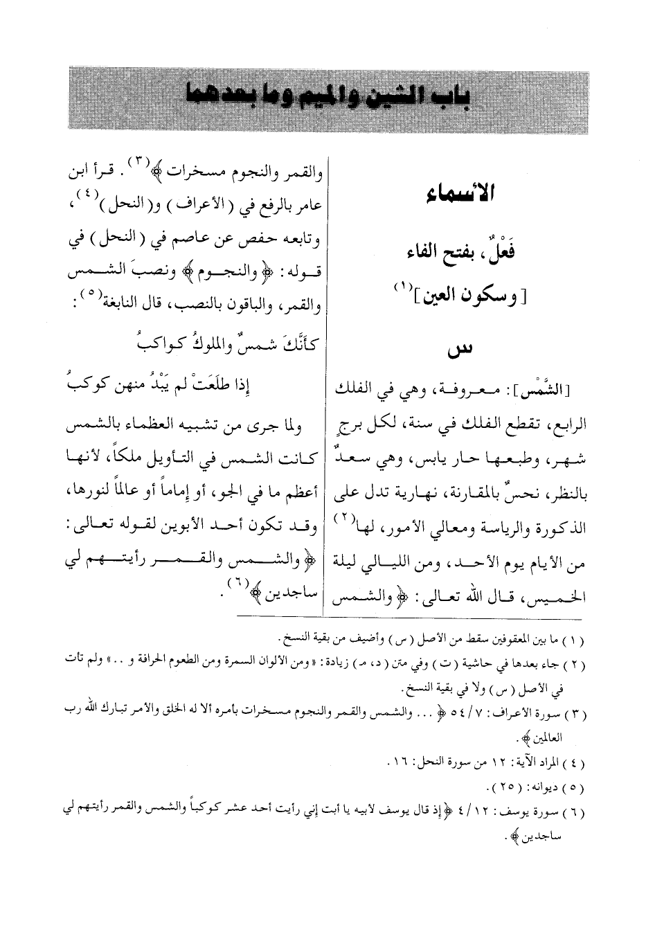 [الشَّمْس]: معروفة، وهي في الفلك الرابع، تقطع الفلك في سنة، لكل برجٍ شهر، وطبعها حار يابس، وهي سعدٌ بالنظر، نحسٌ بالمقارنة، نهارية تدل على الذكورة والرياسة ومعالي الأمور، لها «2» من الأيام يوم الأحد، ومن الليالي ليلة الخميس، قال اللّاه تعالى: وَالشَّمْسَ وَالْقَمَرَ وَالنُّجُومَ مُسَخَّرااتٍ* «3». قرأ ابن عامر بالرفع في (الأعراف) و (النحل) «4»، وتابعه حفص عن عاصم في (النحل) في قوله: وَالنُّجُومُ ونصبَ الشمس والقمر، والباقون بالنصب، قال النابغة «5»: