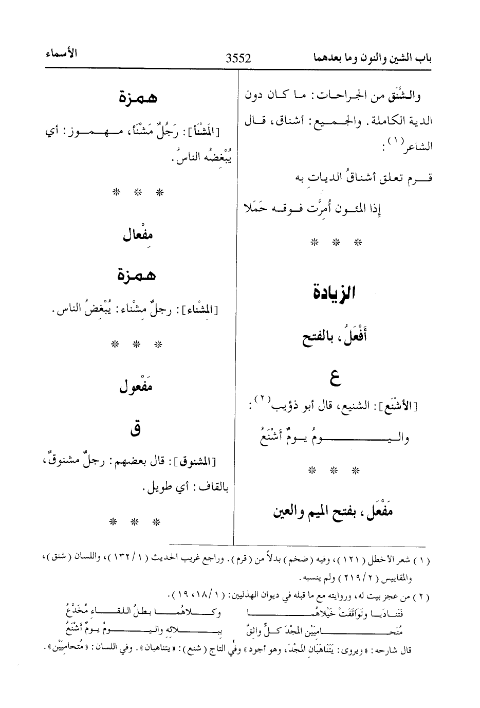[المَشْنَأ]: رَجُلٌ مَشْنَأ، مهموز: أي يُبْغِضُه الناسُ.